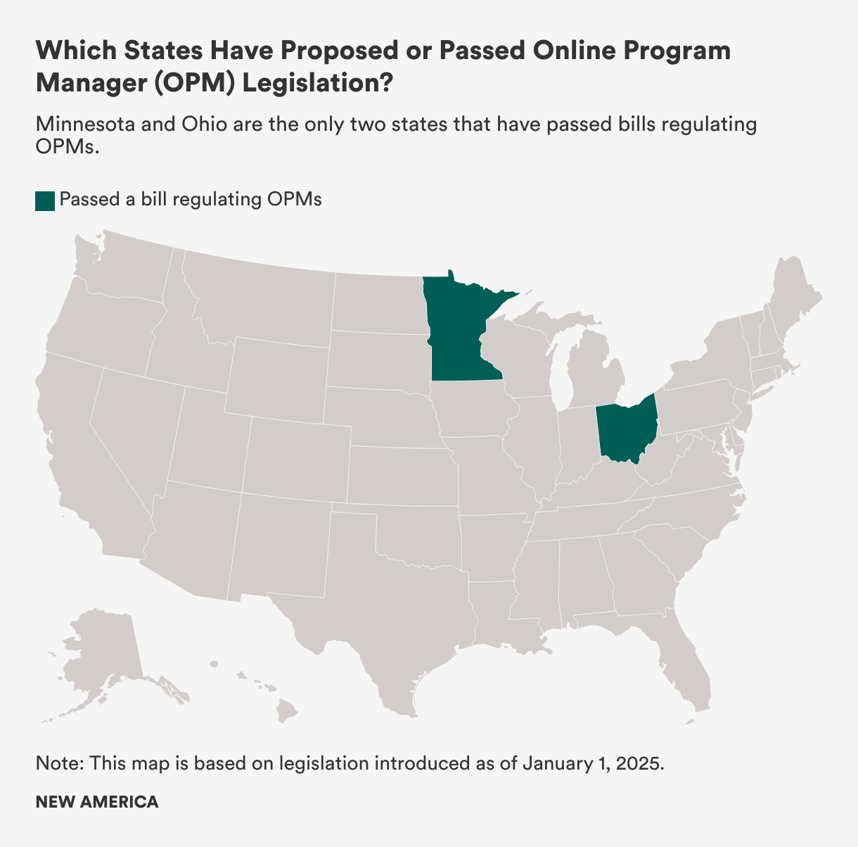 The map below tracks state-level reform efforts to regulate OPMs. Updated July 2025 to reflect Ohio passing OPM legislation.
