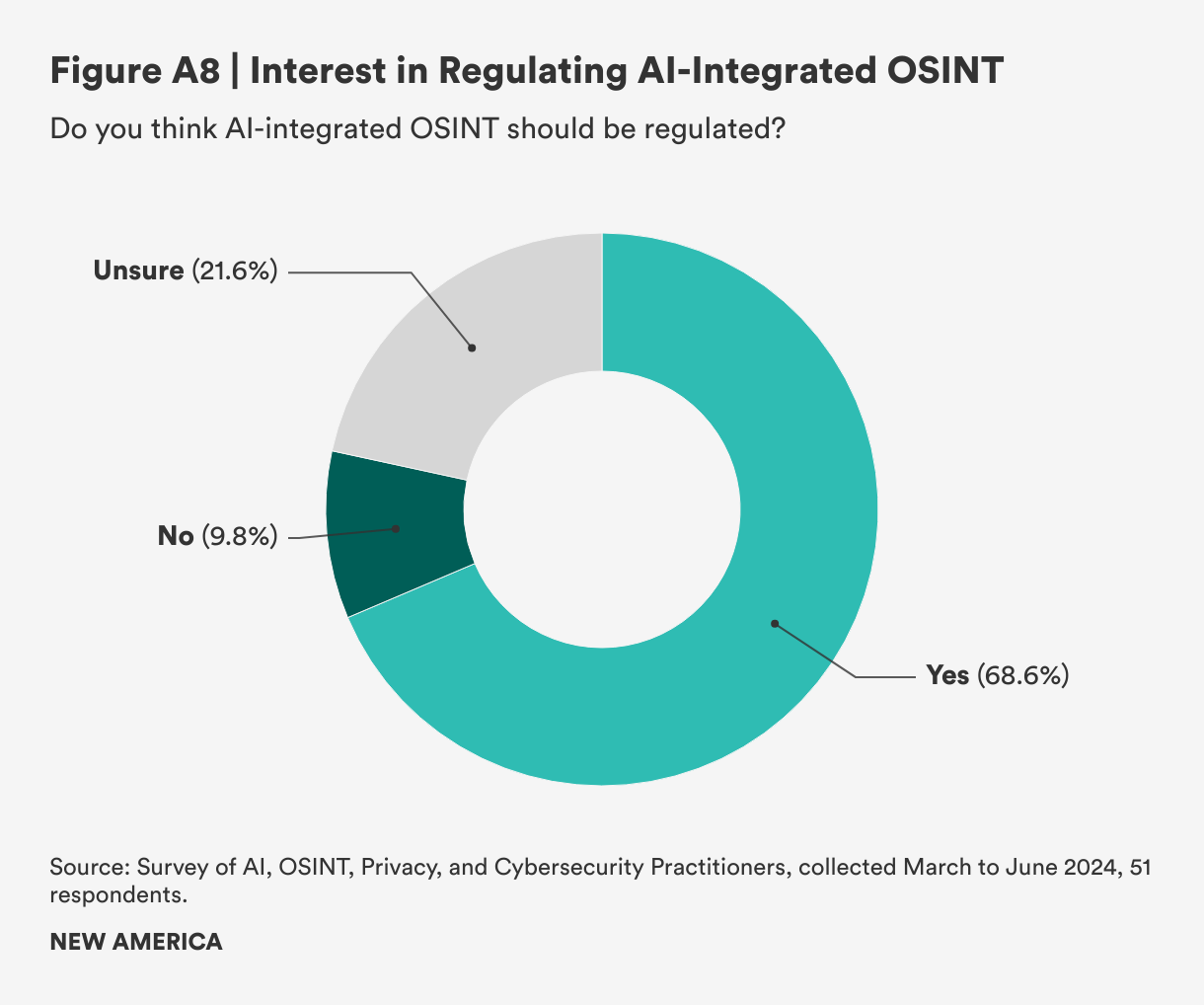 From the expert sample, nearly 69 percent advocate for regulating AI-integrated OSINT, which in this survey means establishing legal frameworks to protect individual privacy. It includes enforcing ethical guidelines and implementing technological safeguards to ensure the responsible and secure use of AI in OSINT. The expert sample expressed a preference for an oversight, highlighting the need for frameworks to protect individual right to privacy through data minimization, transparency, accountability, and the enforcement of ethical guidelines to ensure responsible and secure use.