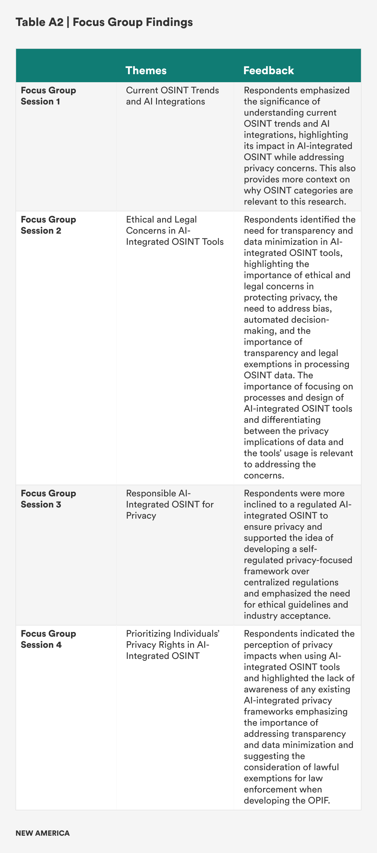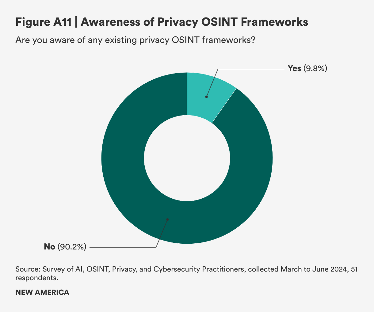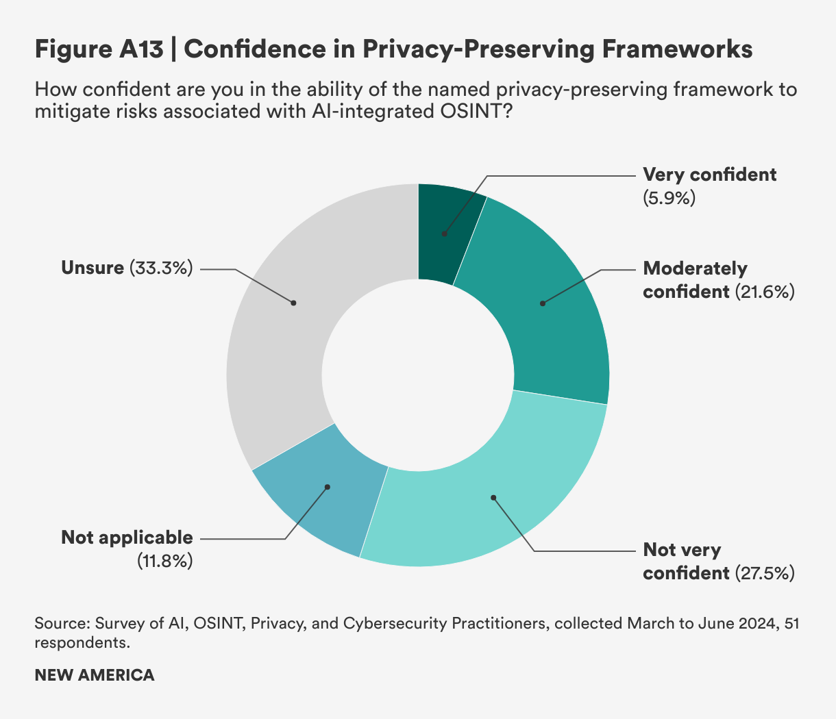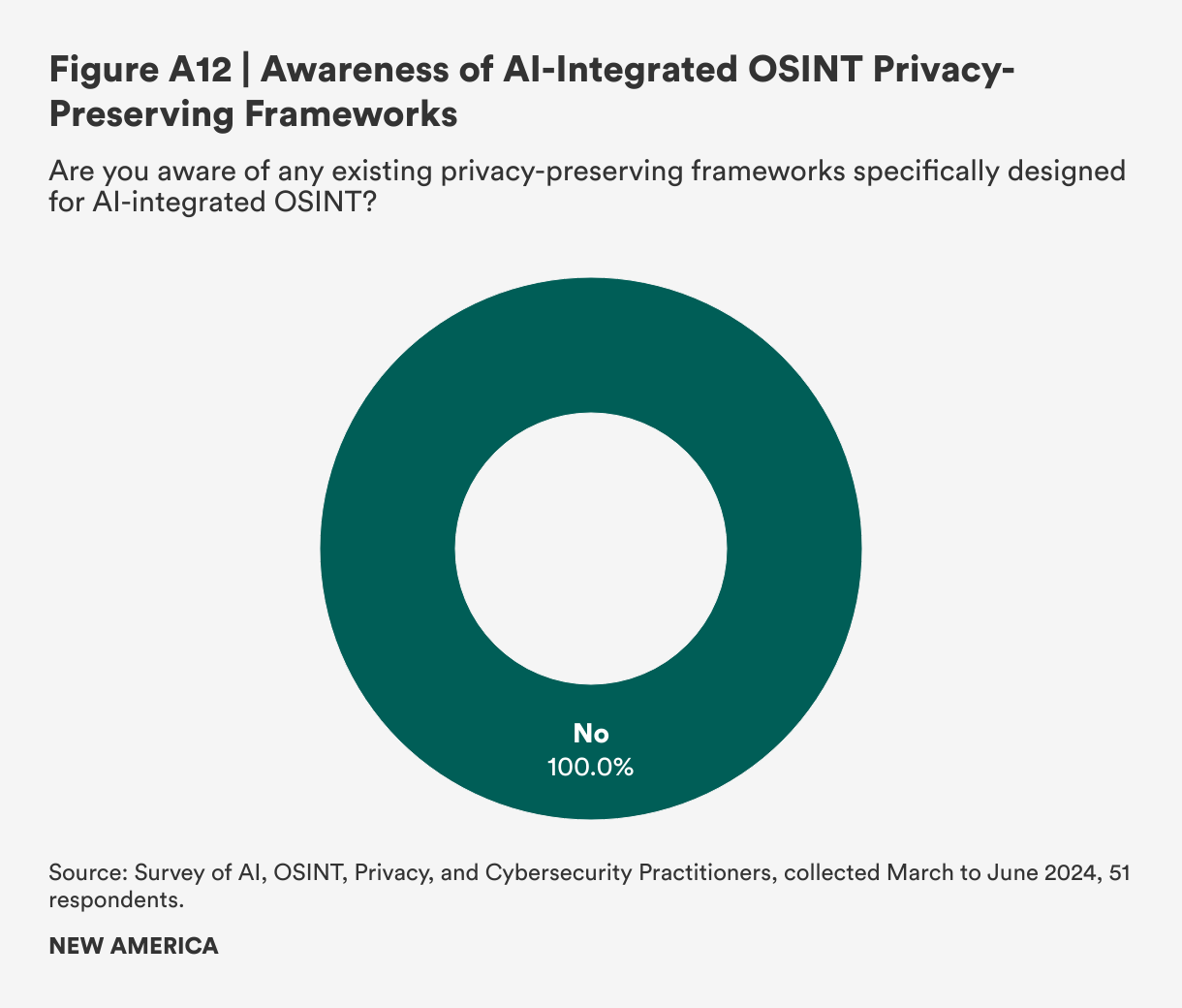 From the expert sample, the survey highlighted a lack of visibility or existence of privacy-preserving frameworks specifically designed for AI-integrated OSINT, tools, processes, and resources, suggesting that research, development, and education are needed to ensure privacy considerations are met in the deployment of AI-integrated OSINT technologies.