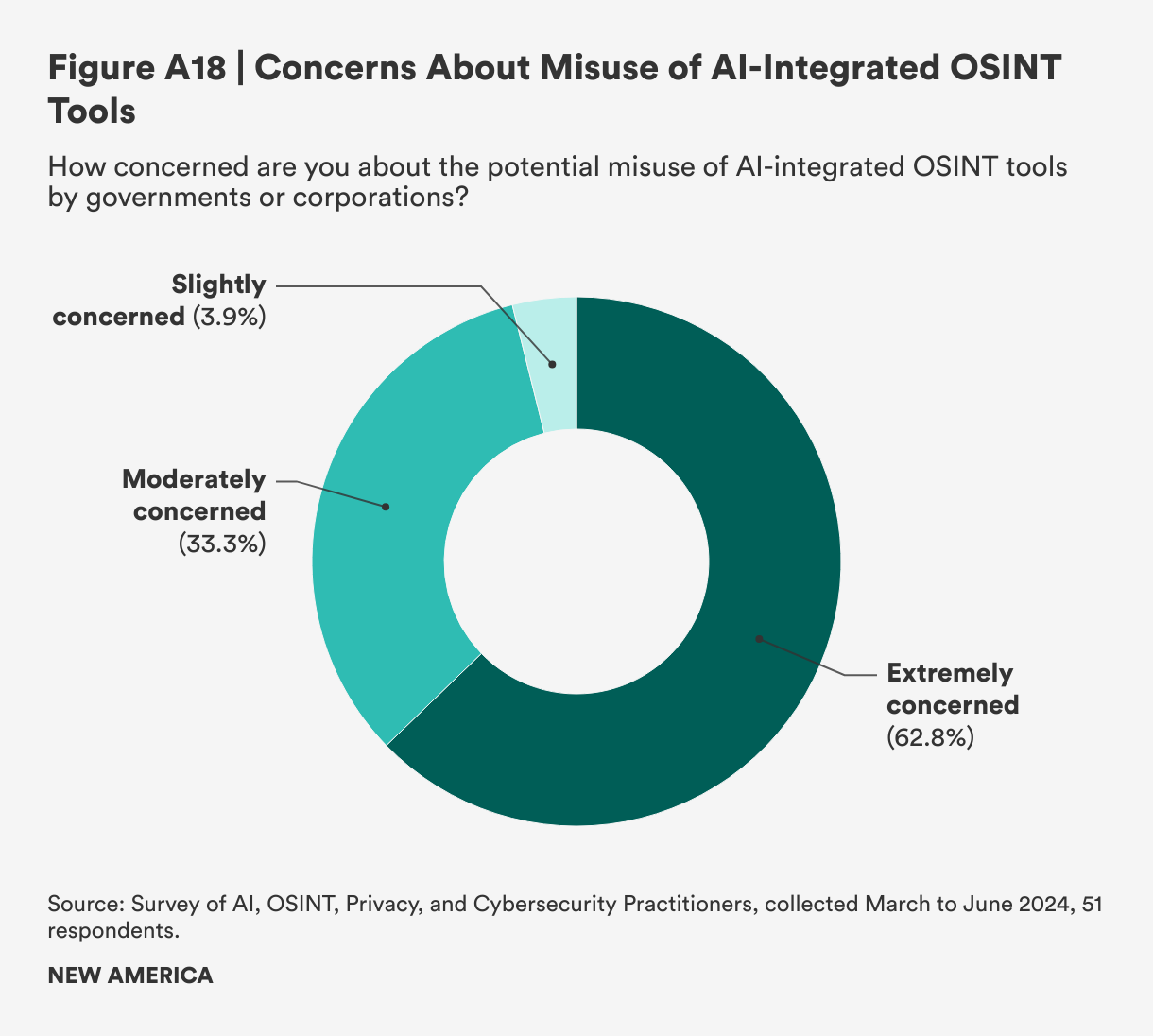 The expert sample survey identified a high level of concern about governments' or corporations' potential misuse of AI-integrated OSINT tools with 63 percent “extremely concerned,” and 33 percent rated “moderately concerned,” indicating apprehensions about these technologies’ ethical implications and potential abuses.