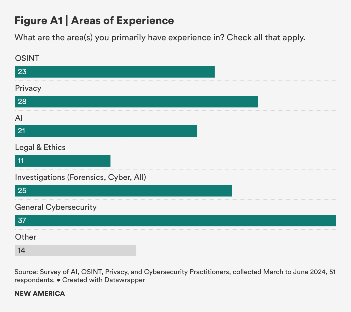Through purposeful sampling of experts in the field, the study prioritizes the quality and relevance of data over quantity, thus enhancing the study’s internal validity. Participants were identified based on their established credentials and active roles in AI, privacy, cybersecurity, and OSINT, ensuring that each contributor could provide informed perspectives. This method aligns with qualitative research best practices, where deep, nuanced understanding from domain-specific professionals can yield findings that are both insightful and directly applicable to the study’s focus. The survey was designed to capture detailed information under three themes: current practices, challenges, and the perceived future direction of these domains. The quantitative survey findings come from 51 expert respondents, and are represented in this report as rounded percentages.