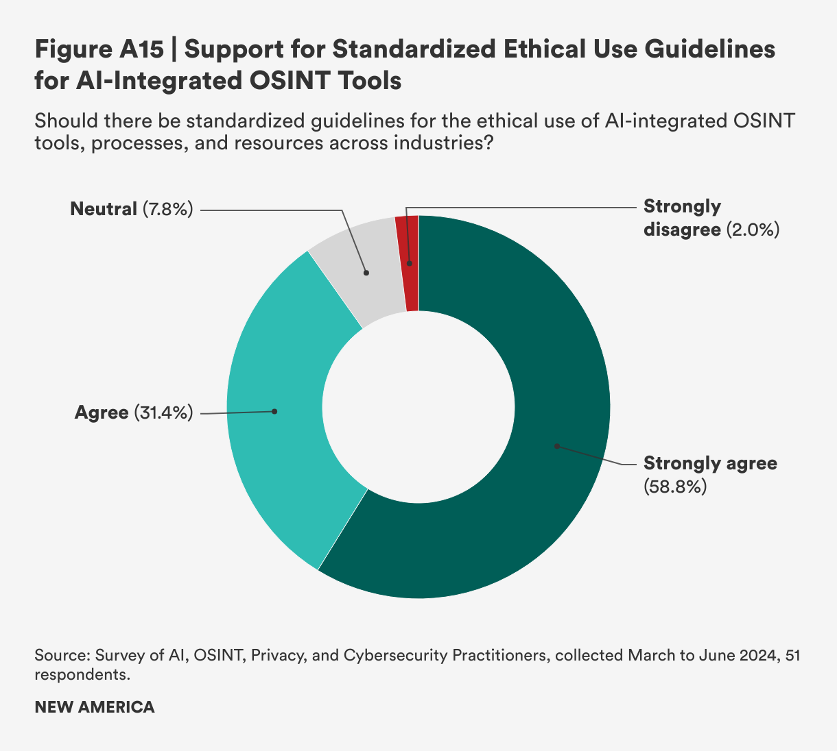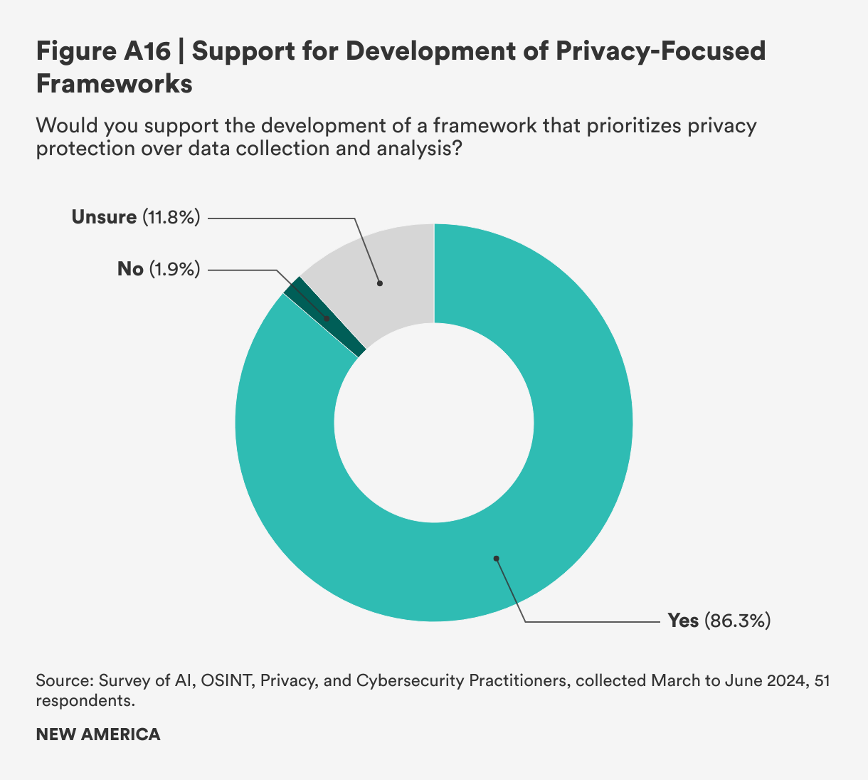 Confidence in the effectiveness of privacy-preserving frameworks is varied, with only a small percentage expressing high confidence. Additionally, respondents showed overwhelming support for the development of privacy-first frameworks, with 86 percent in favor (see Figure A16). The consensus also extends to the belief in the need for international agreements to regulate the use of AI in OSINT, with 88 percent agreeing on this necessity, reflecting global concern over the ethical use of AI in intelligence gathering (see Figure A17). The full survey and results can be found in Appendix 1.