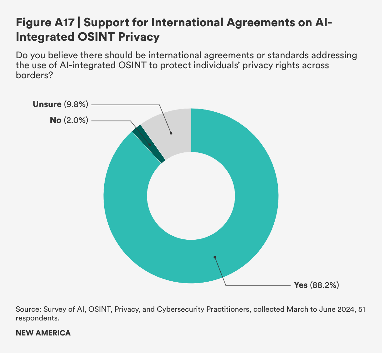 The findings also indicate overwhelming support for international agreements to protect privacy in the context of AI-integrated OSINT, with 88 percent of respondents advocating for global standards (see Figure A17). This call for international cooperation is crucial in addressing the cross-border nature of data and the global implications of AI technologies. Furthermore, the high level of concern about the misuse of AI OSINT tools by governments and corporations, expressed by 63 percent of respondents, underscores the need for stringent measures to prevent ethical abuse (see Figure A18).