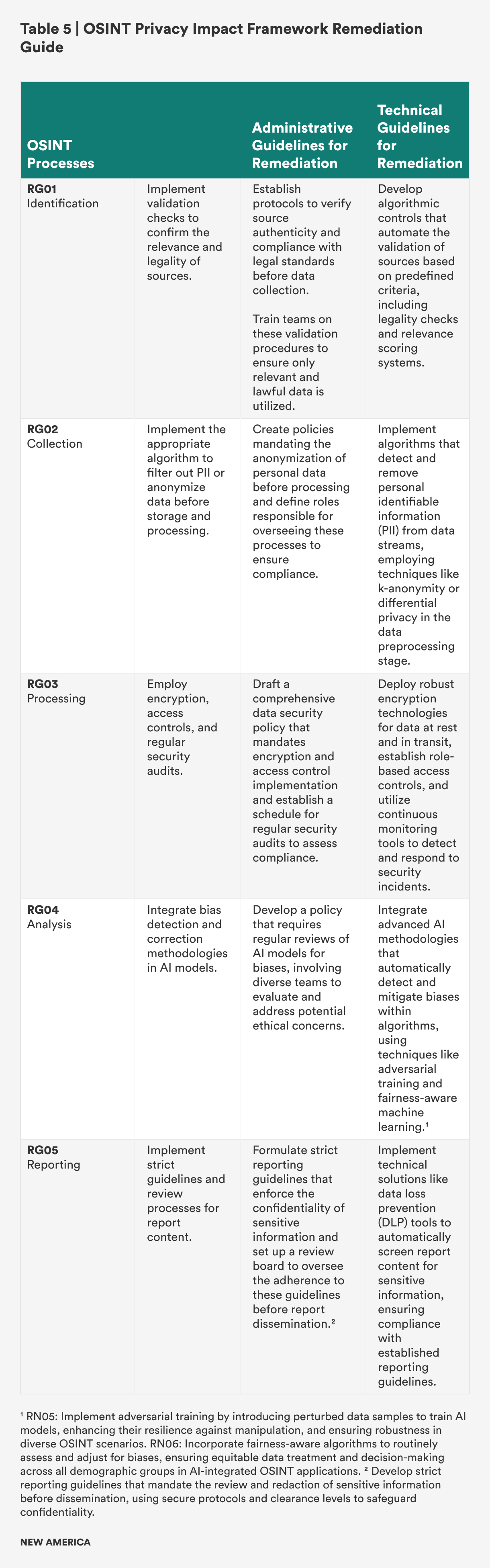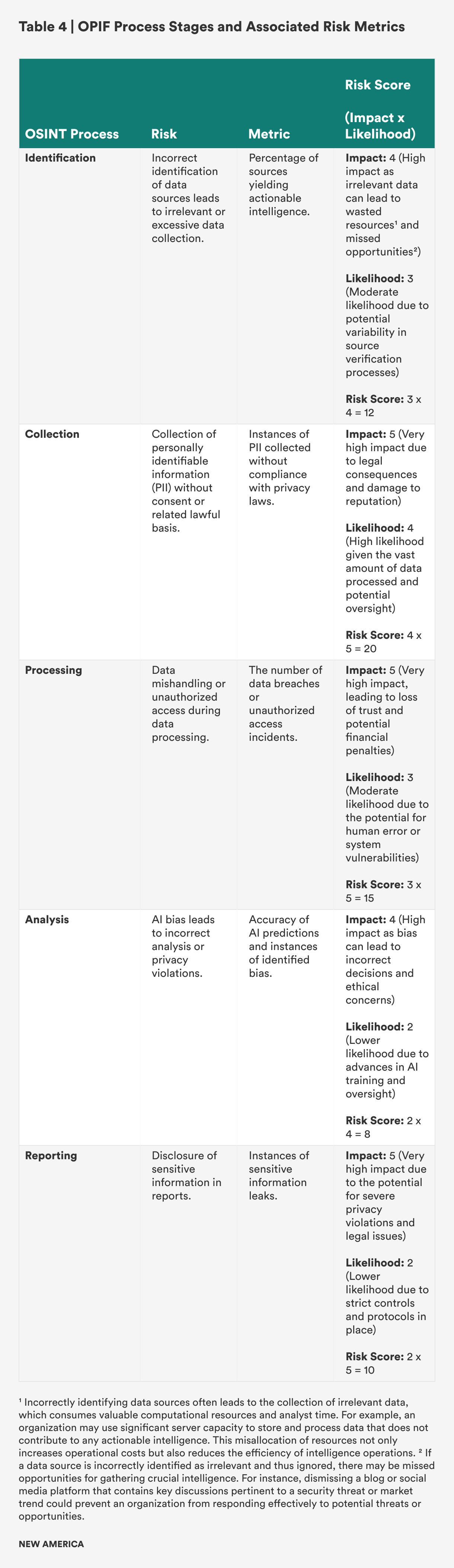 OPIF is a four-part tool developed to manage privacy risks in AI-integrated OSINT processes. OPIF starts with a Three-Step Privacy Baseline, foundational to ensuring that data is handled with utmost care throughout its lifecycle. This baseline, informed by NIST and ISO standards, mandates minimal data collection, responsible processing, and secure retention. Such measures are pivotal not only in aligning with regulatory frameworks like GDPR, CCPA, and HIPPA but also in fostering trust and ethical standards in AI applications within OSINT. The second step in the framework, the OSINT Process Flow Impact Assessment, leverages the GDPR’s Data Protection Impact Assessment and the Privacy by Design approach to scrutinize each stage of the OSINT cycle. This impact assessment is crucial for preemptively identifying privacy risks and establishing guidelines that ensure these risks are effectively managed throughout the data lifecycle. By meticulously outlining how each stage should be handled, the framework guarantees that all personnel involved are well-informed of their responsibilities toward privacy preservation. In the heart of the OPIF lies a Risk Metric Score system, which integrates the risk management principles of NIST RMF and ISO 31000. This scoring system evaluates the potential privacy risks associated with AI-integrated OSINT activities by assessing both the likelihood of occurrence and the severity of impact, and therefore quantifies risks and guides prioritization of mitigation efforts. The final component of the OPIF is the Risk Guide, which provides comprehensive remediation strategies that can be employed by anyone who uses the framework. The guide outlines both administrative and technical measures that can be adhered to address identified risks. From data validation and bias mitigation to secure reporting and privacy protection, the guide covers a broad range of actions designed to enhance the integrity and security of the AI-integrated OSINT processes. This ensures that the framework is not merely reactive but proactive in strengthening the overall data handling and intelligence production processes.