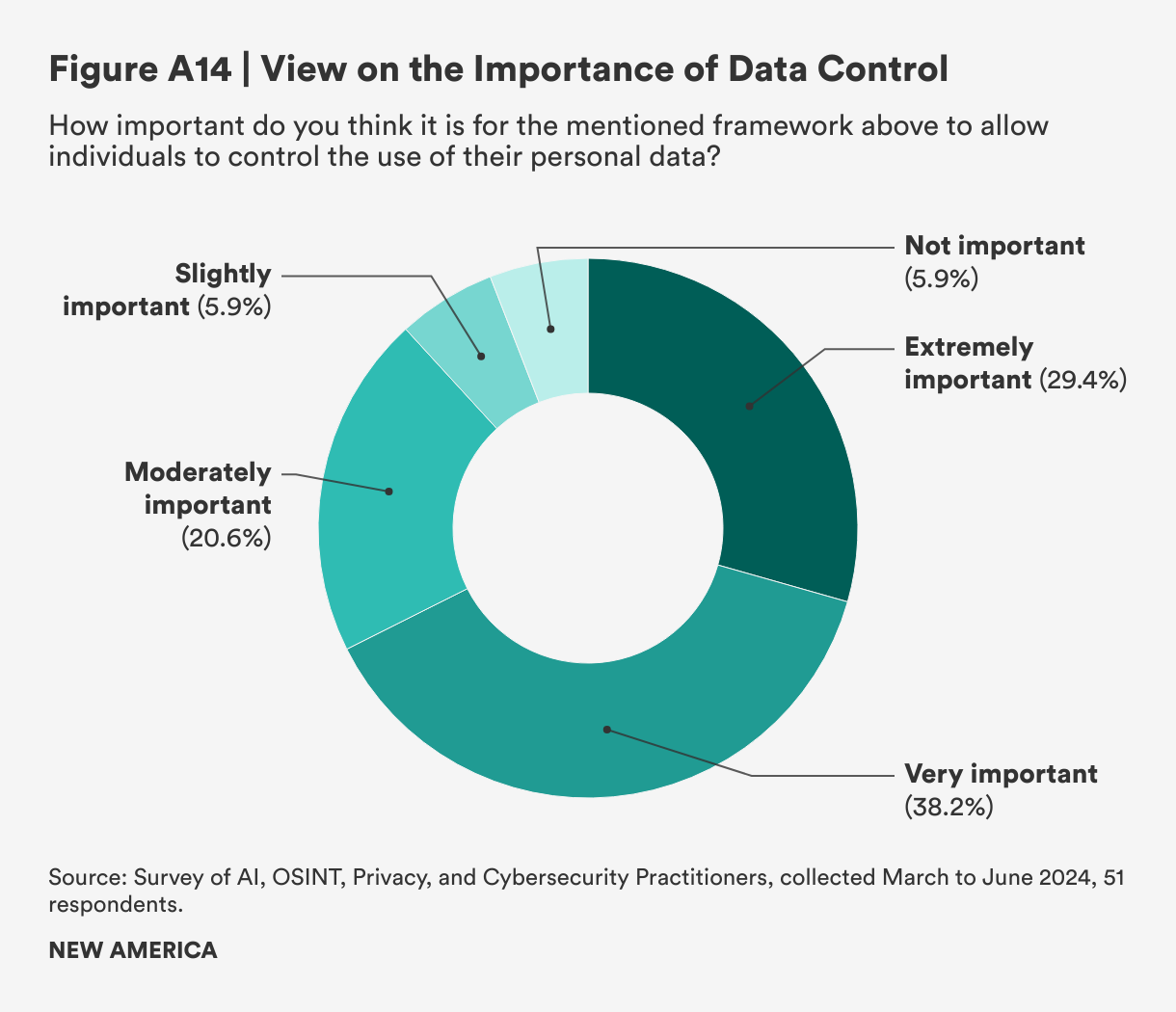 The expert sample responses see controlling personal data in AI-integrated OSINT tools as an important element within the privacy frameworks, with 29 percent considering it “extremely important,” 38 percent “very important,” and 21 percent rating it as “moderately important.”