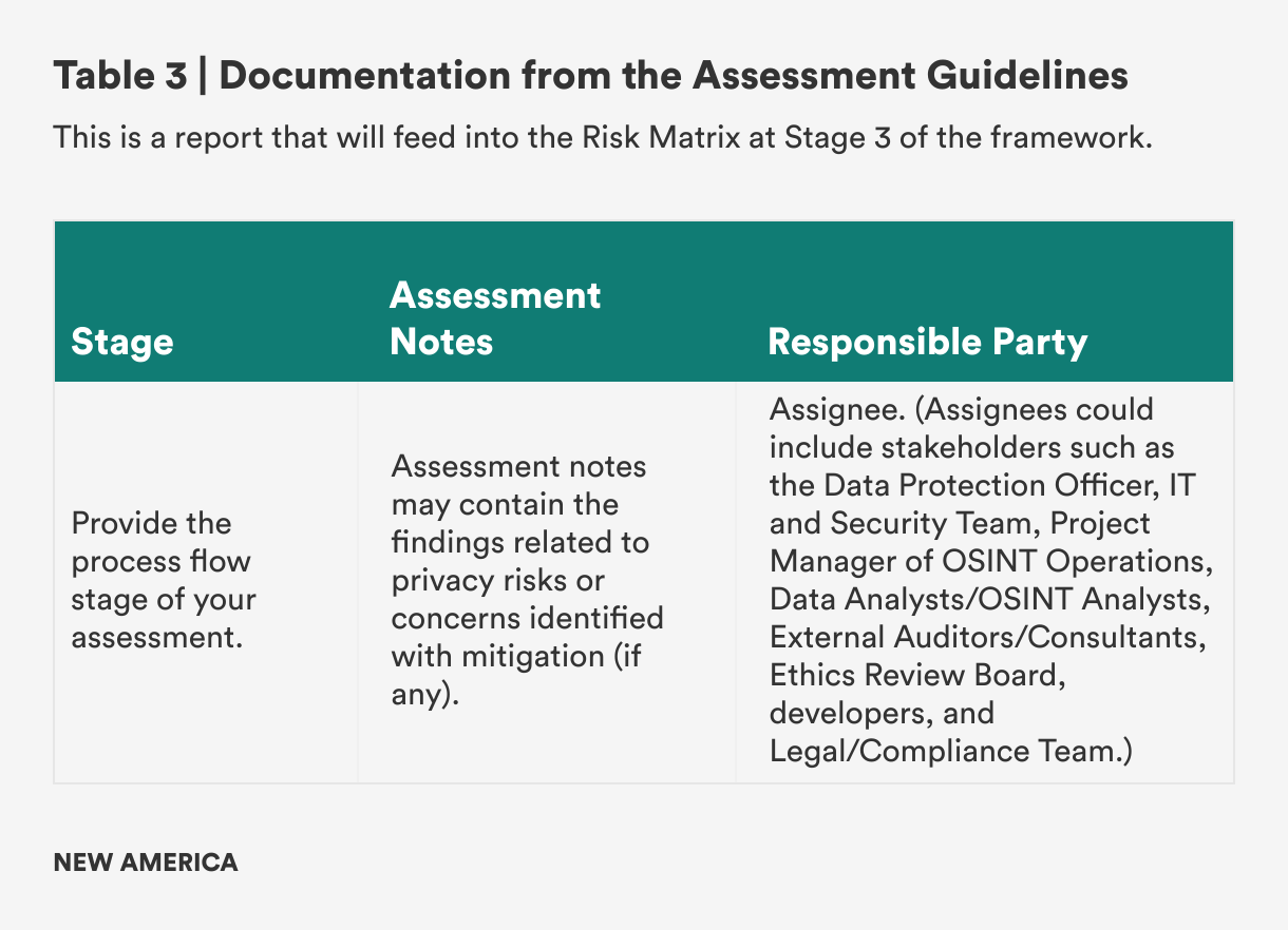 In the second phase of the framework, an assessment chart provides a structured approach to evaluating and ensuring and promoting privacy compliance throughout an OSINT process. This aligns with the GDPR DPIA and Privacy by Design principles, as illustrated in the image below. A detailed assessment guideline accompanies each OSINT process stage. The guideline seeks to ensure that privacy risks are identified, evaluated, and mitigated at every step of the OSINT workflow. Each OSINT process stage must be evaluated with the corresponding privacy considerations, controls, and mitigations. The assessment details must be documented leveraging the assessment notes including specific document findings, observations, and recommendations for each stage.