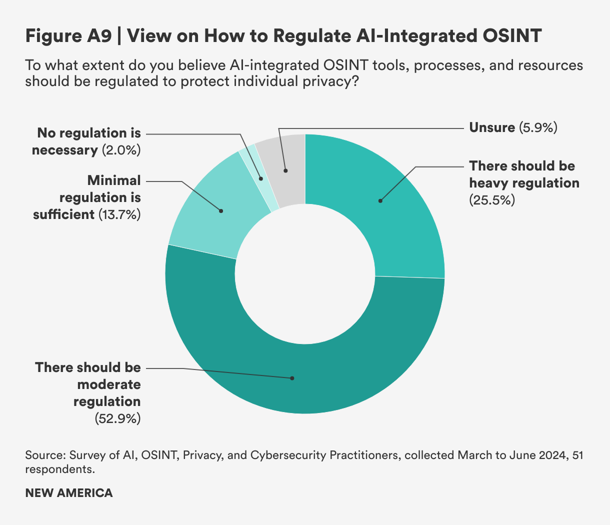 The survey, based on an expert sample, reflects a consensus for regulation; however, there is divergence in the degree of regulation of AI-integrated OSINT tools to safeguard privacy. It was recorded that nearly 53 percent advocate for moderate regulation as a balanced approach.