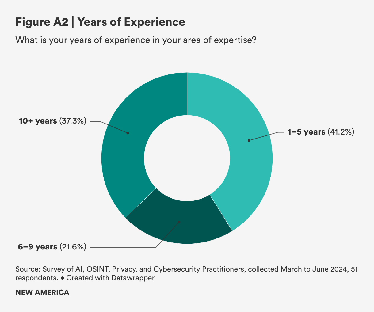 The research survey was administered online from March 2024 to June 2024. The survey findings in this report are drawn from a purposive sampling of 51 experts with requisite experience in OSINT, artificial intelligence, cybersecurity, and data privacy (referred to as the “expert sample” throughout this report). Participants were selected for their specialized knowledge because they converged in more than one of the requisite experiences, ensuring that the insights captured were both accurate and contextually relevant to the study’s specific aims. This approach, typical in exploratory research on complex topics, prioritizes expertise over a broad sample, thereby providing depth and reliability in the analysis. Targeting seasoned professionals under the expert sampling yields nuanced, actionable data that supports the study’s objectives and contributes to the field of practice. The aggregate results are illustrated in this section.