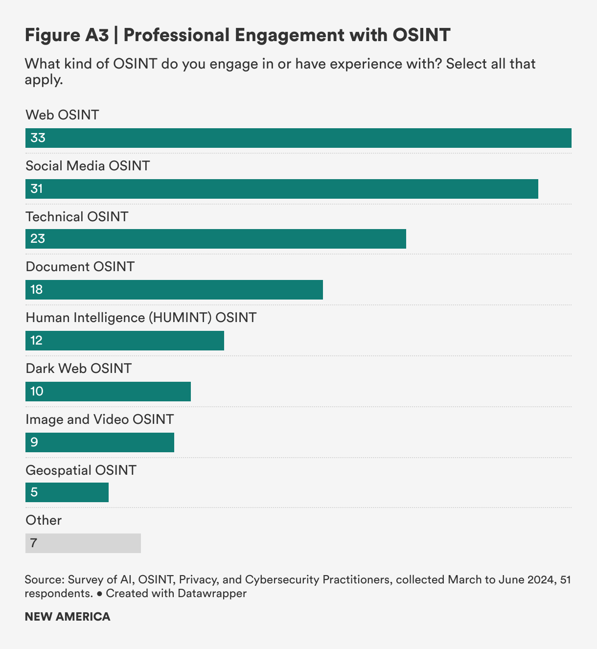 Considering the diverse categories of OSINT, as reflected in Appendix 1, the implementation of privacy-preserving measures must be tailored to the specific characteristics of each type. From the survey, 65 percent and 61 percent of professionals engage in web and social media OSINT, respectively, where appropriate lawful basis, robust consent mechanisms, and transparency in data use are crucial. Technical and document OSINT, used by 45 percent and 35 percent of survey respondents, respectively, require heightened security protocols to protect sensitive information. HUMINT and Dark Web OSINT, with their inherent risks, necessitate stringent ethical guidelines and secure communication channels. For image and video OSINT (18 percent), and geospatial OSINT (10 percent), utilized by survey respondents, data anonymization and secure storage solutions are imperative (see Figure A3).