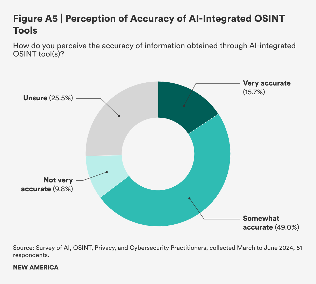 The current practices surrounding OSINT and AI integration reflect a wide engagement across various types of OSINT, with professionals utilizing sources such as the web, social media, and technical data. Despite this engagement, there remains a significant lack of awareness concerning AI-integrated OSINT tools, as 73 percent of respondents were unfamiliar with them. However, for those aware, social media platforms and public databases were the primary sources utilized. The perceived accuracy of AI-integrated OSINT is moderate, with 49 percent of respondents rating it as somewhat accurate, indicating room for improvement in the reliability of AI tools in this domain (see Figure A5).