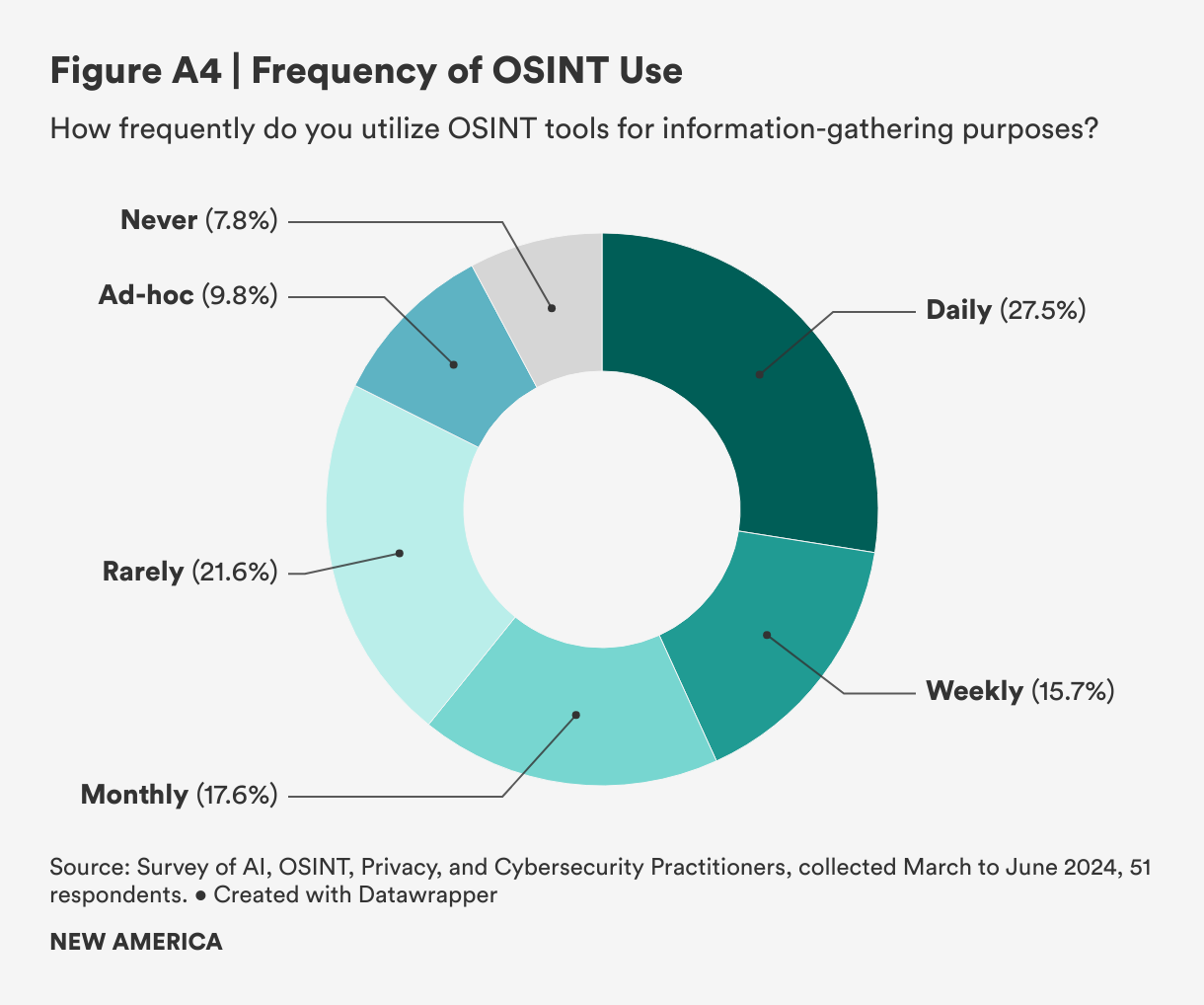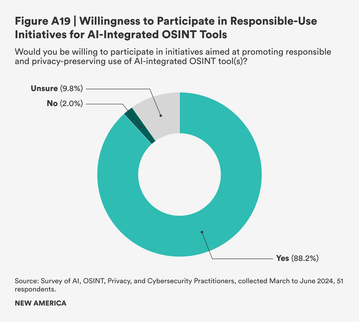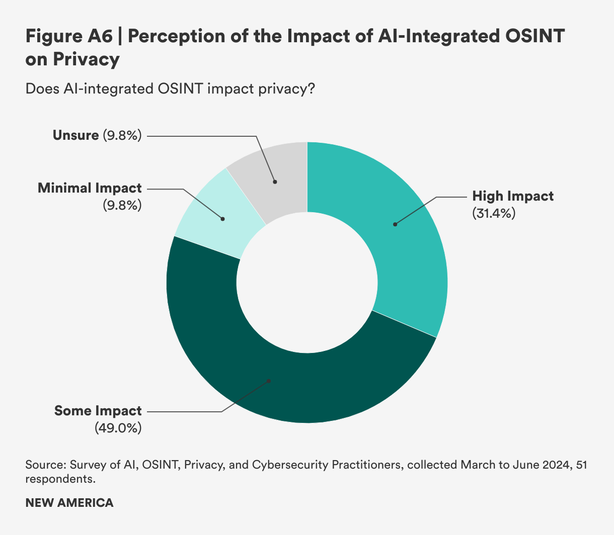 Despite the potential benefits of AI in enhancing OSINT efficiency, the findings reveal a significant gap in awareness among professionals regarding AI-integrated OSINT tools, with only 28 percent of respondents familiar with such technologies. Furthermore, perceptions of the accuracy of AI-derived OSINT data are mixed, with nearly half of the respondents’ expressing reservations. This calls for an increased focus on educating OSINT practitioners about the privacy impact of AI technologies and improving the technologies reliability. By addressing these concerns through targeted policies and education, AI integration in OSINT will not only enhance operational effectiveness but also adhere to the highest standards of privacy and ethics. This alignment with responsible AI practices is essential for the sustainable and ethical advancement of OSINT capabilities.