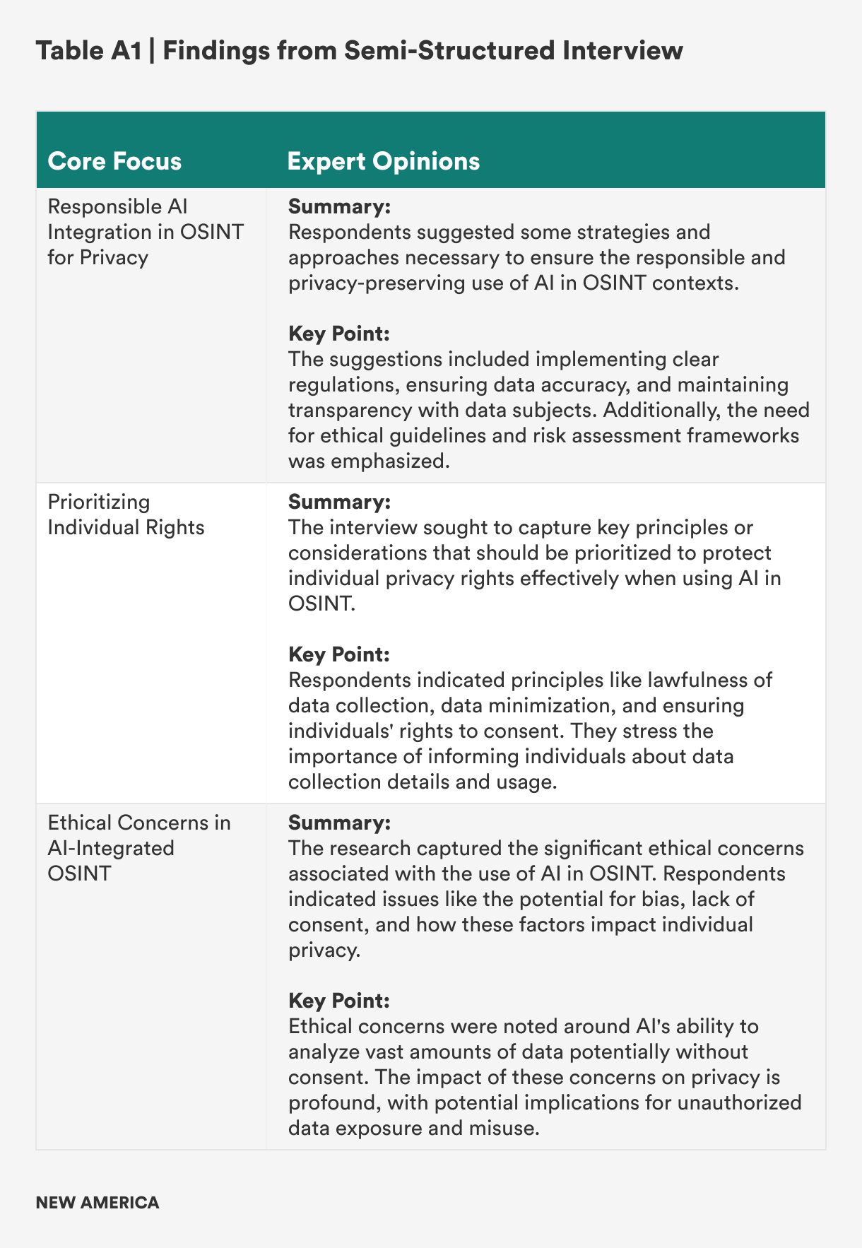 All qualitative responses were coded thematically to identify recurring themes, challenges, and best practices recommended for AI-integrated OSINT. A summary of key findings from both types of interviews is presented in Table A1 referenced in Appendix 2.