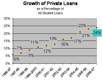 Overall, students borrowed $18.5 billion in private loans from for profit companies and state nonprofit lenders in the 2006-07 academic year, or six percent more than in the prior year, the College Board reports in the latest version of its annual student aid survey. That total is a significant drop from the average annual increases of about 27 percent during the last five years.