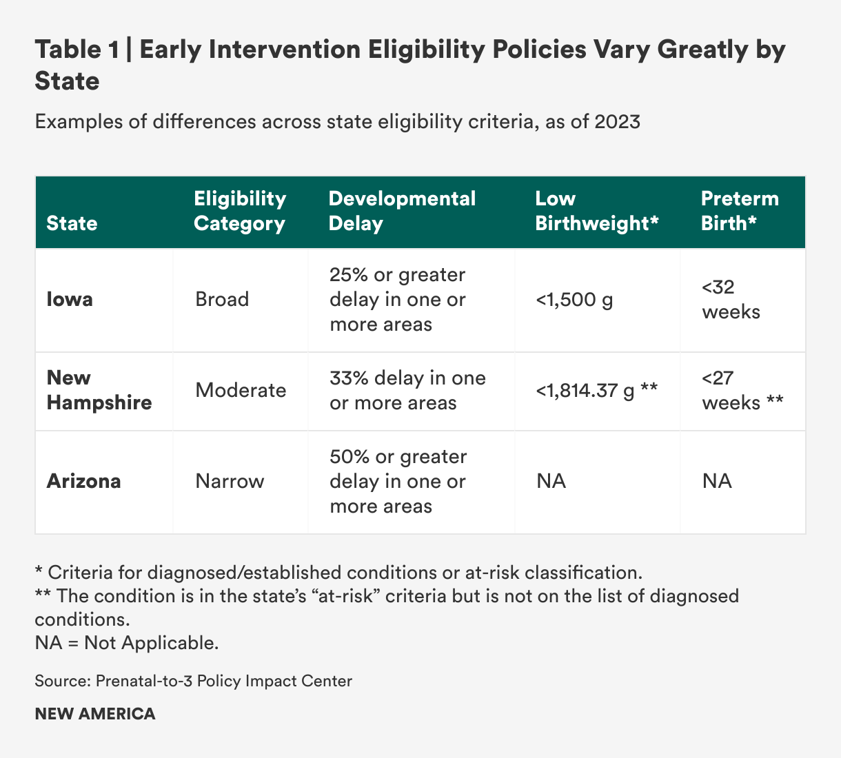 - “Variation Across States in Criteria Used to Determine Eligibility for Early Intervention Services,” Prenatal-to-3 Policy Impact Center, Vanderbilt University, source.