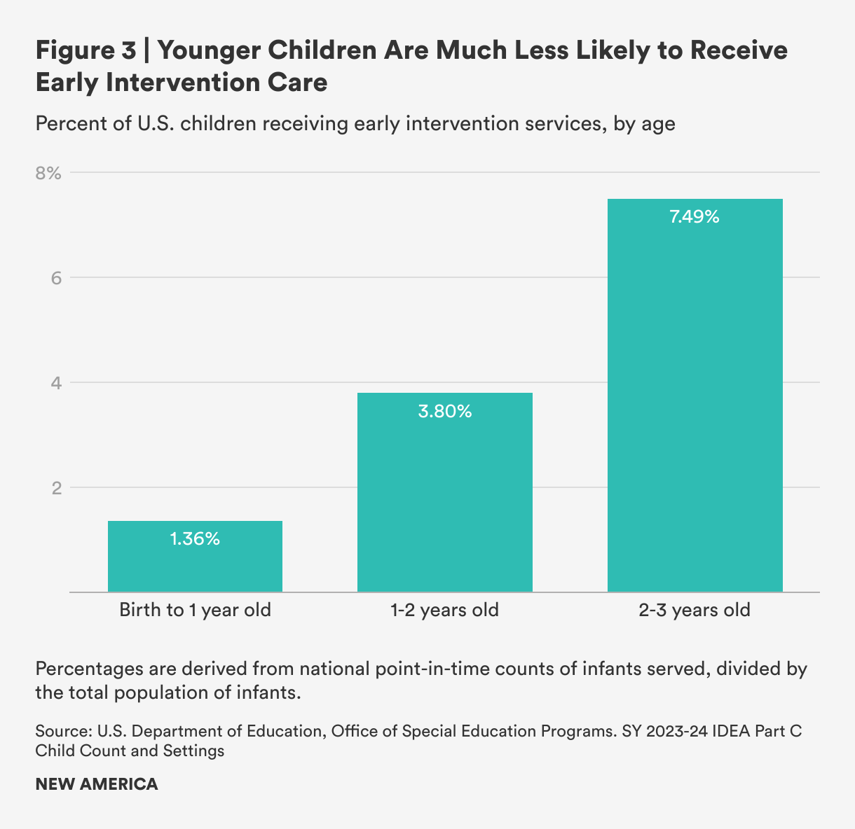 - In 2023, 7.7 percent of children under age three received early intervention services when counted cumulatively throughout the year. See: Office of Special Education Programs, “IDEA Section 618 Data Products: Part C Child Count and Settings, Table 10 (SY 2023 to 2024),” U.S. Department of Education, <a href="<a href="<a href="<a href="source">source">source">source">source">source. Cumulative counts are not available for infants under age one, and this data relies on a “point-in-time” count. Of babies under age one, 1.35 percent received early intervention services and 4.2 percent of children under age three received early intervention services in 2023 according to point-in-time data collected in fall 2023. See: Office of Special Education Programs, “IDEA Section 618 Data Products: Part C Child Count and Settings, Table 4 (SY 2023 to 2024),” U.S. Department of Education, <a href="<a href="<a href="<a href="source">source">source">source">source">source.