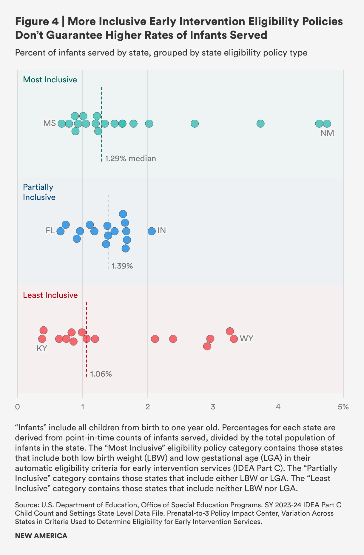 To gauge the potential effectiveness of automatic eligibility, we looked at state eligibility policies’ inclusion of low birth weight and low gestational age and categorized each as “most inclusive,” “partially inclusive,” or “least inclusive” across all 50 states and the District of Columbia.18 We looked for any correlation between inclusivity and the percentage of infants served according to program data (see Figure 4). We found that policies characterized as most inclusive did not necessarily correspond with a higher rate of infants served, while some states with least inclusive eligibility policies serve a relatively high percentage of infants. Our analysis shows that strong policies alone do not necessarily result in higher early intervention service rates for infants and their families, and we theorize that implementation challenges are likely a factor, along with longstanding underfunding.