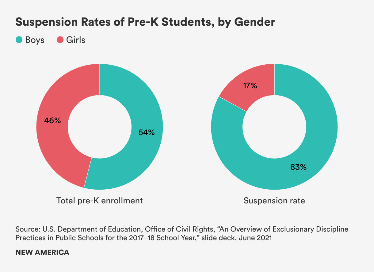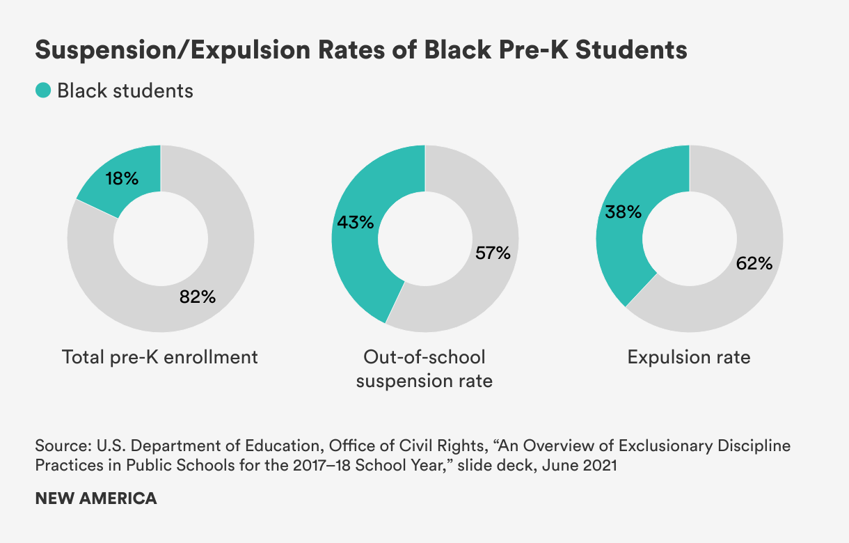 While exclusionary discipline is a problem for all students, it is particularly troubling given the data suggesting disproportionate rates of suspensions and expulsions for young Black children. The 2017–18 Civil Right Data Collection reveals that Black pre-K students are suspended from school at disproportionately high rates. Black children make up 18 percent of total pre-K enrollment, but received 43 percent of out-of-school suspensions and 38 percent of expulsions.7 Black boys in pre-K were both suspended and expelled at a rate more than three times their share of total enrollment. The data also show that boys overall were more likely to be suspended than girls, with boys representing 83 percent of pre-K suspensions despite making up only 54 percent of total pre-K enrollment.8