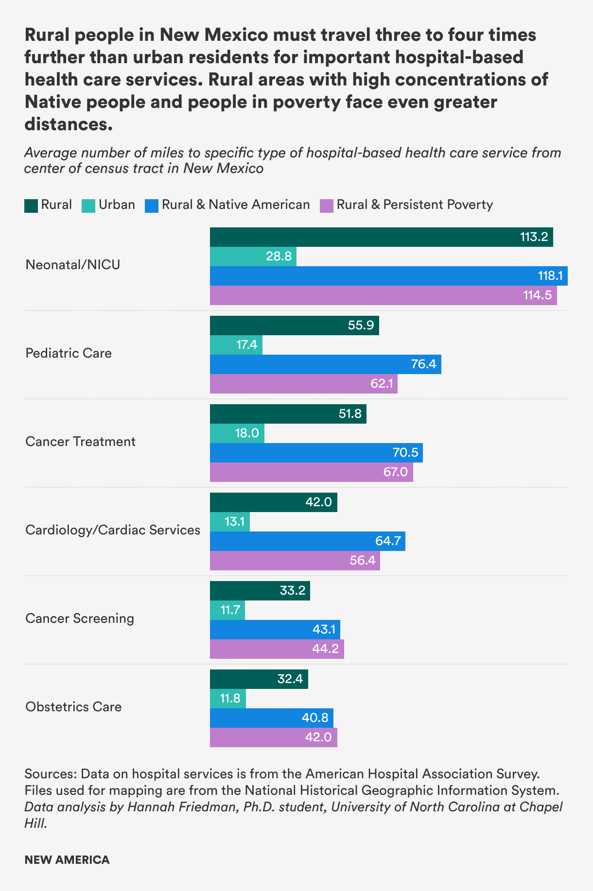 New Mexicans who live in rural census tracts with high concentrations of people in persistent poverty face average distances to care in excess of 40 miles for obstetrics care and cancer screening, 60 miles for pediatric care and cancer treatment, and they are nearly 115 miles, on average, from the nearest NICU. Rural New Mexico census tracts where Native Americans are concentrated are also more than 40 miles from obstetrics care and cancer screening, 65 to 76 miles from pediatric care, cancer treatment and cardiac care, and a stunning 118 miles, on average, from the nearest NICU. [2]