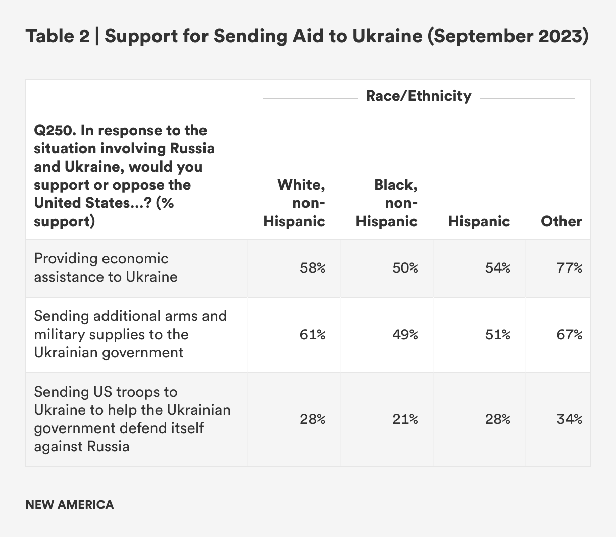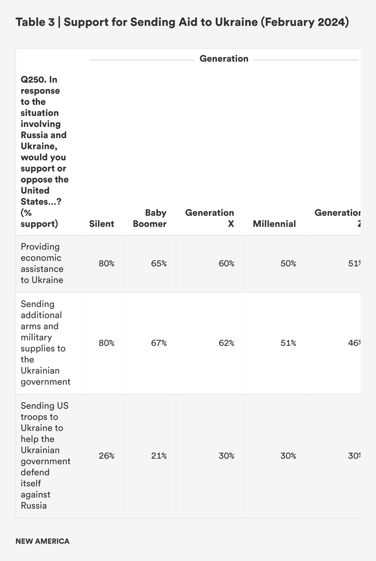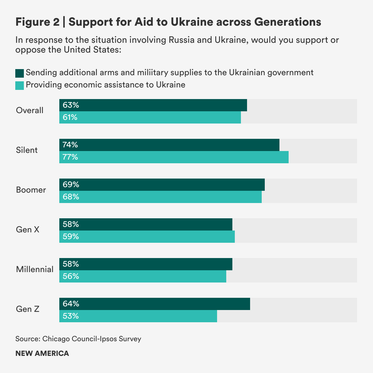The February 2024 Chicago Council-Ipsos survey also found declining support for sending aid to Ukraine among Black and Hispanic Americans, as well as among Millennials and Generation Z. Like Democrats, White and older Americans held steadfast in their support (see appendix tables 1–4).