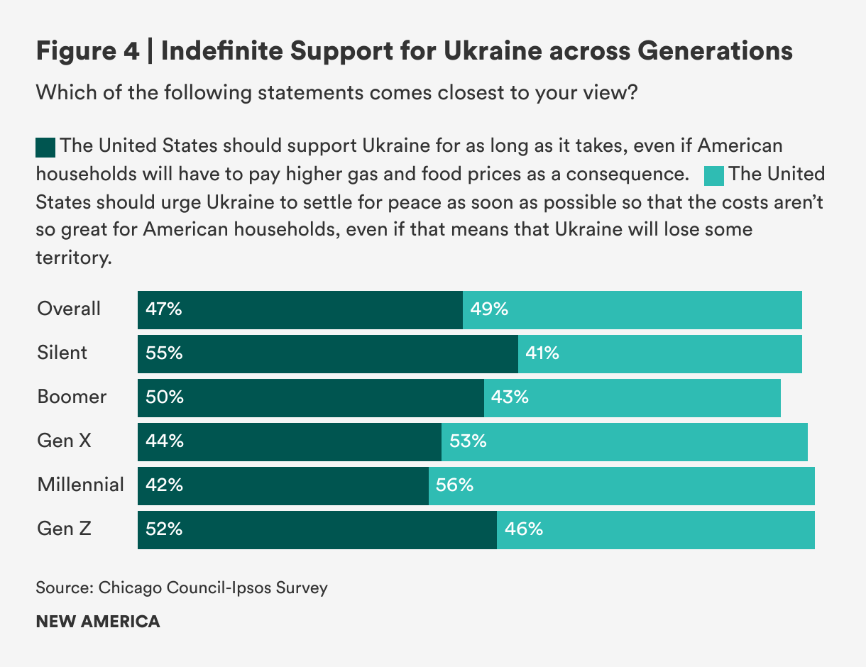In a similar vein, Americans of different generations were somewhat divided on whether the United States should support Ukraine’s war efforts for as long as it takes. A slight majority of the Silent Generation, Boomers, and, notably, Generation Z, said they would support Ukraine for the long run. On the other hand, Generation X and Millennials were less willing to endure higher costs of living to defend Ukraine.