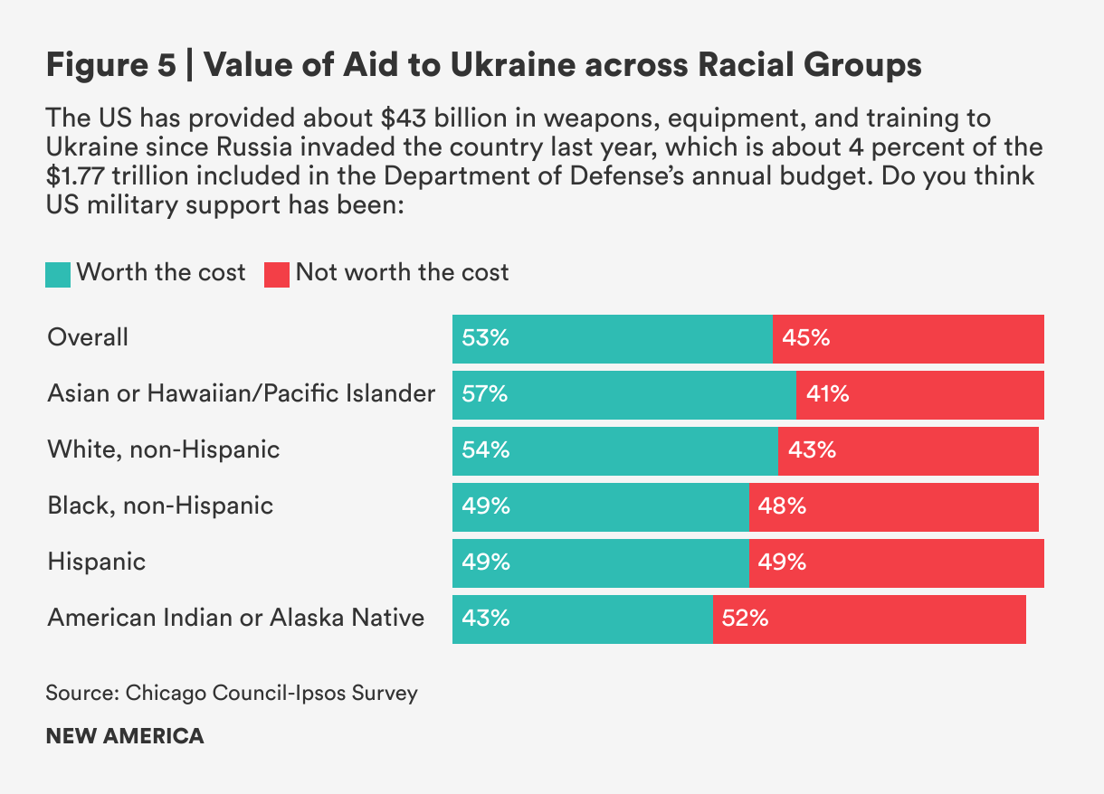 The data show that AAPI and White Americans are most inclined to say the investments the United States has made in weapons transfers and training for Ukraine has been worth the cost (57 percent and 54 percent, respectively). Comparatively, Black and Hispanic Americans express less confidence that U.S. military aid to Ukraine has been worth the cost and are divided equally (both say worth the cost at 49 percent). Native/Alaskan Americans are the least likely to say it has been worth the cost (43 percent), as a slim majority said it has not been worth the cost (52 percent).