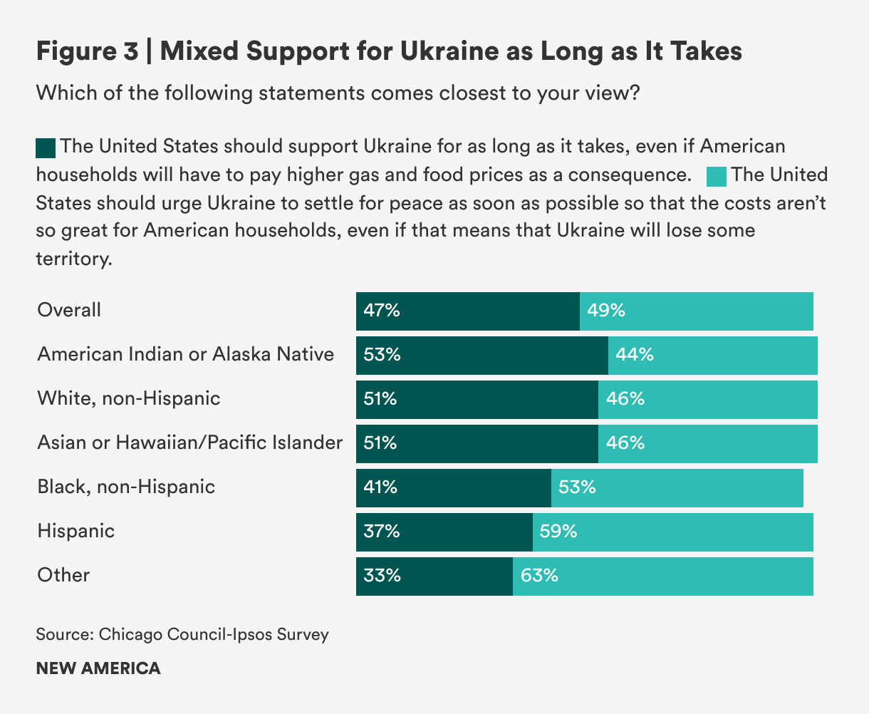 • Black, Hispanic, Generation X, and Millennial Americans were also less willing to endure higher costs of living to support Ukraine for as long as it takes to retake its territory from Russia and instead preferred that the United States encourage Kyiv to settle for peace.