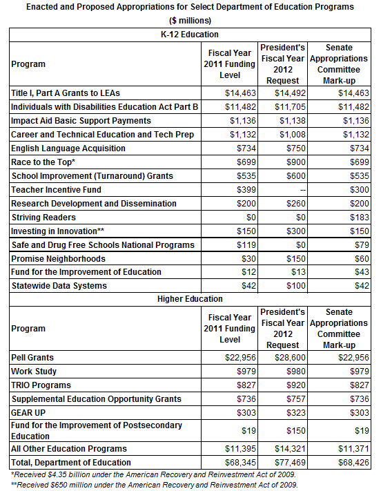The Senate Appropriations Committee bill maintains the vast majority of funding for Department of Education programs in 2012. But this only represents what the Democratic-controlled Senate leadership supports. It is highly unlikely that the Republican-controlled House will provide as generous a budget for the Department of Education. Because the final appropriations bill must be passed by both houses, it will probably differ greatly from the current Senate Appropriations Committee bill. The fiscal year 2012 appropriations process is still far from over.
