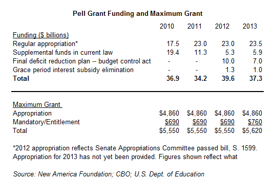 The most complicated aspect of the 2012 appropriations process is Pell Grant funding. The Senate Committee’s bill provides $23 billion in discretionary funding for Pell Grants, the same as in 2011, but also provides a supplement of $1.3 billion to the regular appropriation to maintain a maximum grant of $5,550 in fiscal year 2012 (and an additional $1.0 billion in 2013). As we’ve discussed previously, the cost of the Pell Grant program is growing and Congress has been struggling each year to maintain the funding that it first provided on in the American Recovery and Reinvestment act of 2009. The Senate Appropriations Committee bill provides the third supplemental funding boost for the program this year, and the second for fiscal year 2012. Earlier this year, Congress provided $10 billion for the program in fiscal year 2012 under the Budget Control Act (the debt ceiling agreement), but only by cutting interest rate subsidies on federal student loans. To provide the latest $1.3 billion in supplemental funding, the Senate Appropriations Committee would eliminate the interest grace period (students would not have to make payments during this six-month period but interest would accrue) on subsidized Stafford Loans for undergraduate students. All together, these many sources of support for Pell Grants make up just enough funding to maintain the maximum grant.