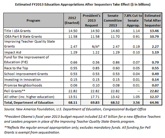 The Labor-HHS-Education fiscal year 2013 appropriations bill that passed the Senate Appropriations Committee earlier this month illustrates how sequestration would affect funding for education programs should that bill become law. Keep in mind that the percentage is only an estimate, and actual spending cuts could look different.