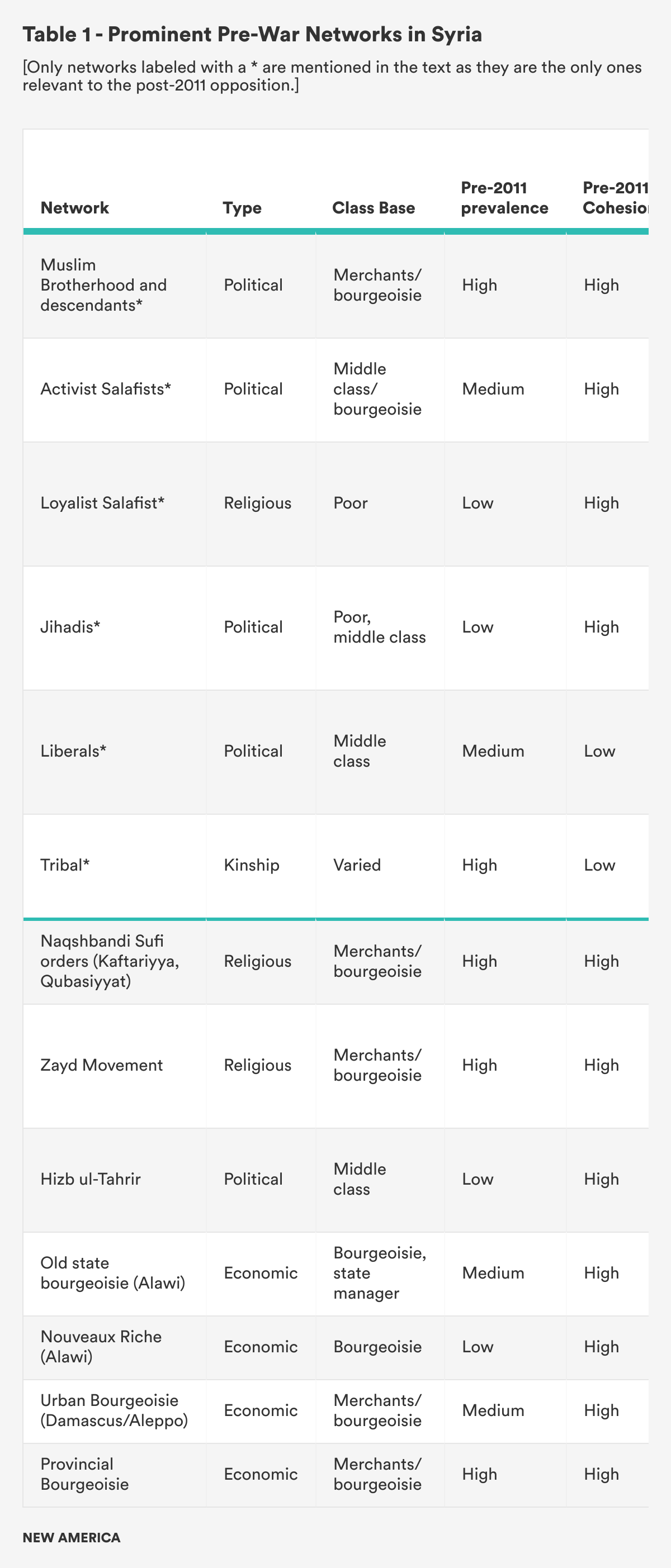 - In Syria, six prewar social networks played the preponderant role in shaping how clients engaged in collective action during the war: liberal, tribal, Muslim Brotherhood, activist Salafi, loyalist Salafi, and Salafi jihadi networks.