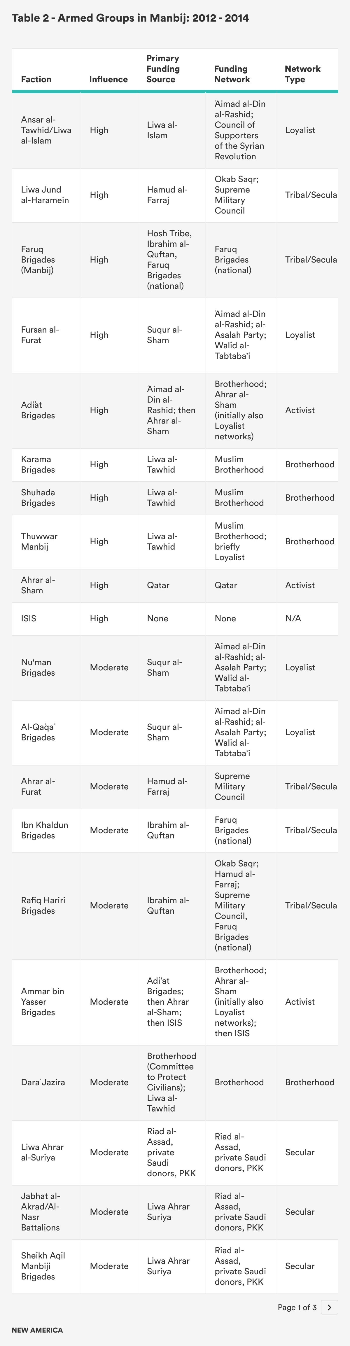 Tribal elites, the second major group backed by the U.S.-Saudi alliance, did not form cohesive cross-tribe networks by the very nature of tribal structure, which is fragmented and fractal-like.4 Moreover, tribal sheikhs owe their authority to their ability to dispense patronage, which required that they maintain access to state power.5 As a result, those sheikhs who were relatively disadvantaged under the Assad regime also lacked significant revenue to cohere national and international networks.6