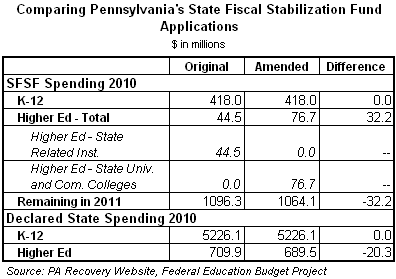 Beyond that, Pennsylvania lowered its declared spending of state funds on higher education in 2010 in its amended application. In fact, the state says it will spend $690 million in state funds in 2010 rather than the original $710 million. This $20 million difference may account for differences in spending between the state-related institutions and the state universities and community colleges.