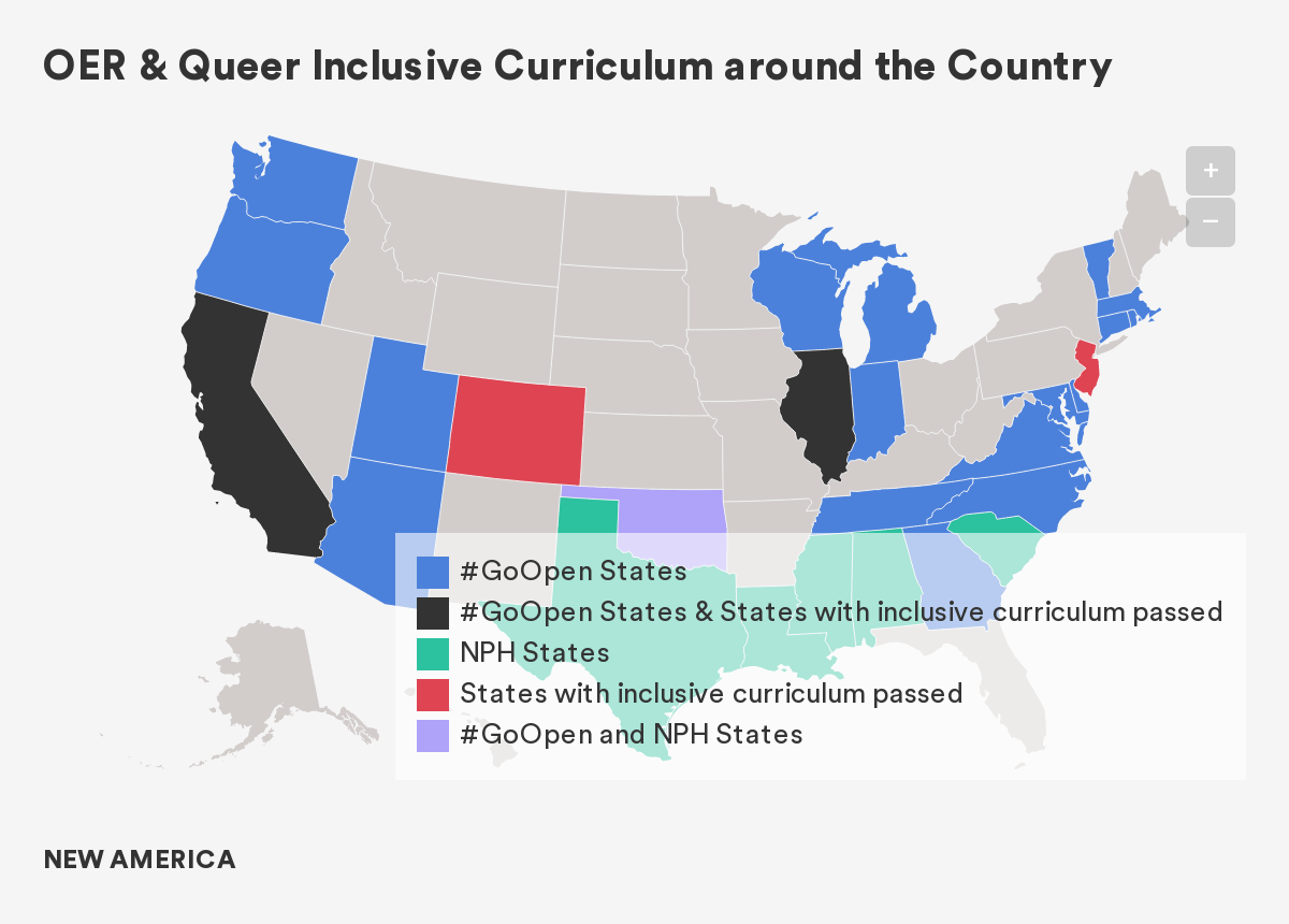 At the same time, there are 20 #GoOpen states and dozens of districts committed to open pedagogy and professional learning.26 Of these states, two—California and Illinois—have also passed inclusive curriculum laws, paving the way for queer-inclusive OER. As the first state to pass an inclusive curriculum and a #GoOpen state to boot, California has an immense opportunity to create openly licensed inclusive learning materials that could then be used by folks around the country. But even with the stars aligned, state education leaders have yet to leverage OER in their efforts. Instead, California is in the costly and arduous process of updating textbooks—a fair indicator that updated teacher professional learning will also come in the form of proprietary materials, if at all.