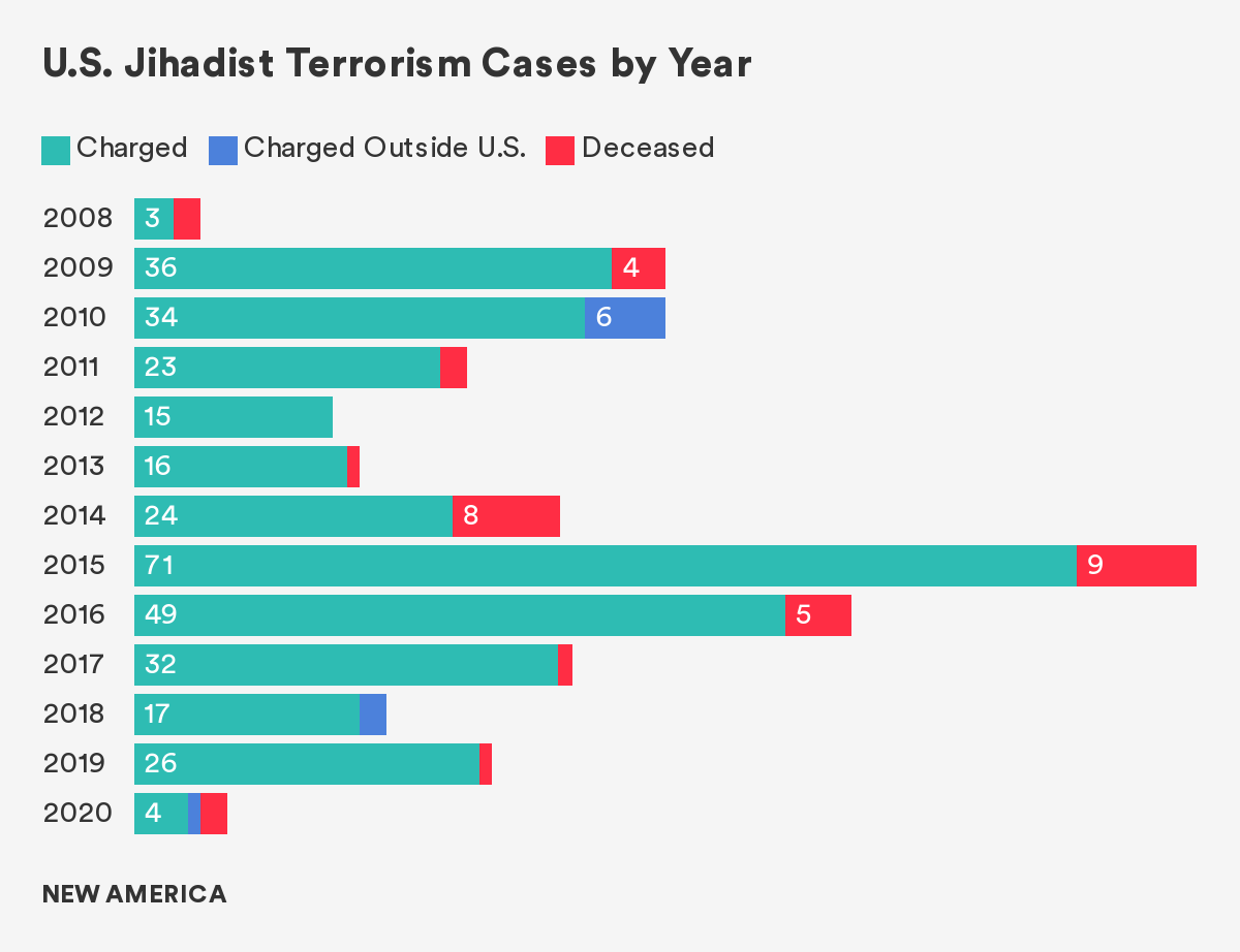 - New America data on jihadist-terrorism related cases includes anyone inside the United States who has been charged in U.S. courts for jihadist terrorism-related activity, American citizens and residents charged in foreign courts for jihadist terrorism related activity, and people who died before being charged with a crime but who are widely reported to have engaged in jihadist criminal activity that would have fallen into one of the above categories had they not died.