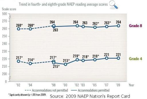 Reading scores for American students have not budged much since two years ago, according to the Nation’s Report Card released yesterday by the Institute of Education Sciences. The report is based on the National Assessment of Educational Progress, a test administered to samples of students nationwide to measure reading comprehension across literary and informational texts.