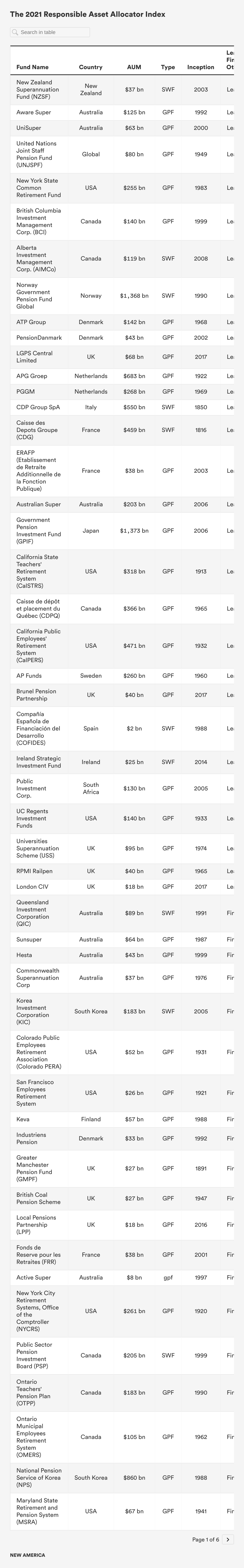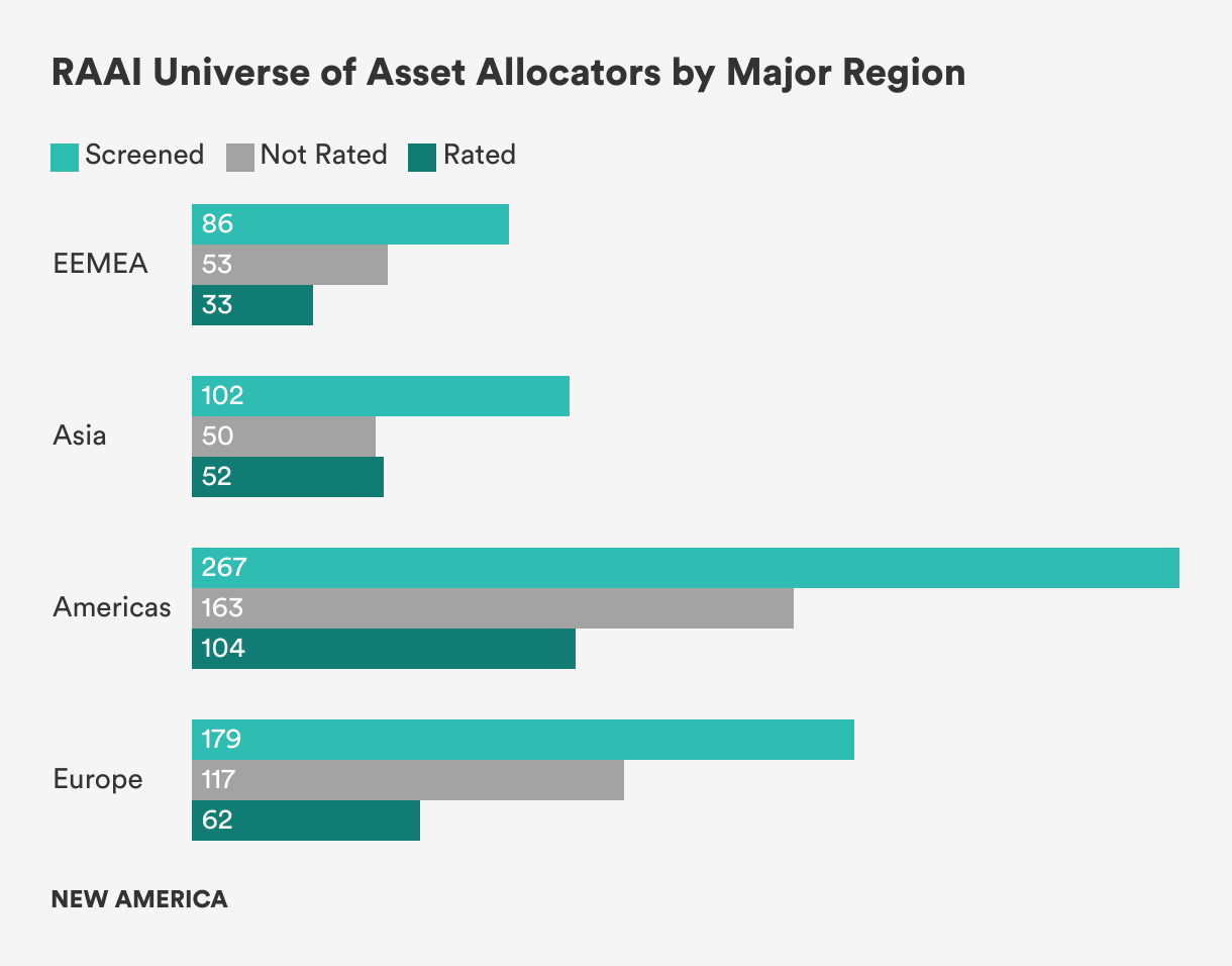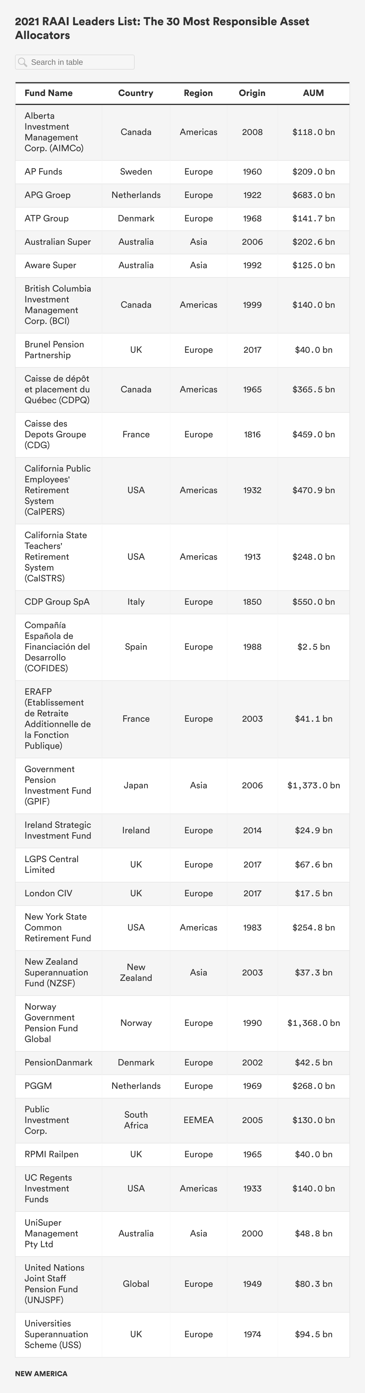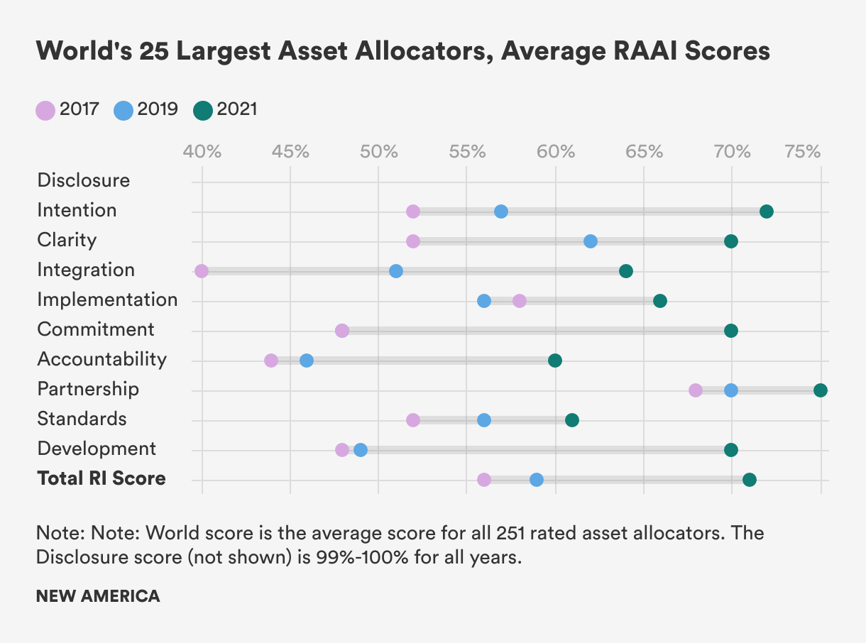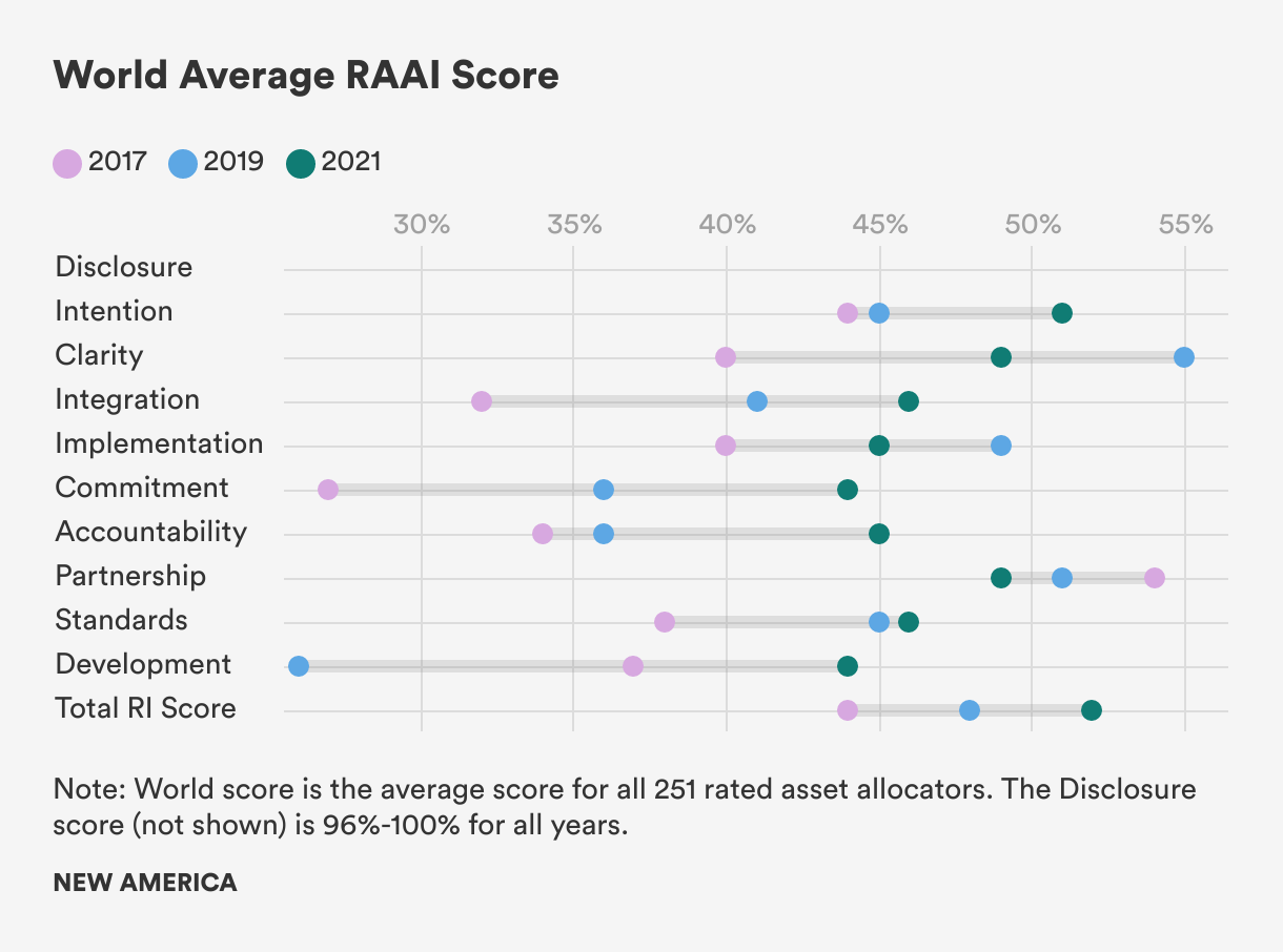 The Responsible Asset Allocator Initiative (RAAI) is focused on mobilizing capital from the world’s largest asset allocators toward responsible investing and the achievement of the United Nations’ Sustainable Development Goals (SDG). The RAAI Index analyzes how the world’s largest long-term investors, including sovereign wealth funds (SWF) and government pension funds (GPF), are developing strategies to manage critical environmental, social, and governance (ESG) issues along 10 core principles and 30 detailed criteria.