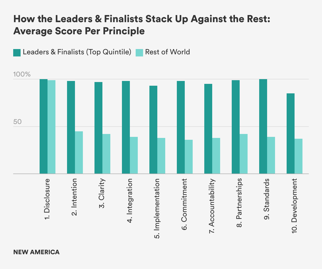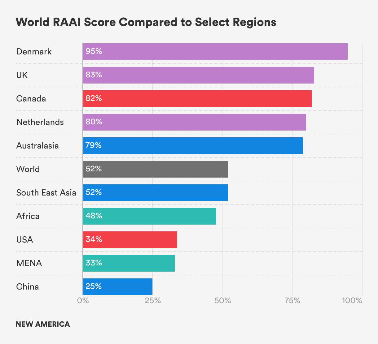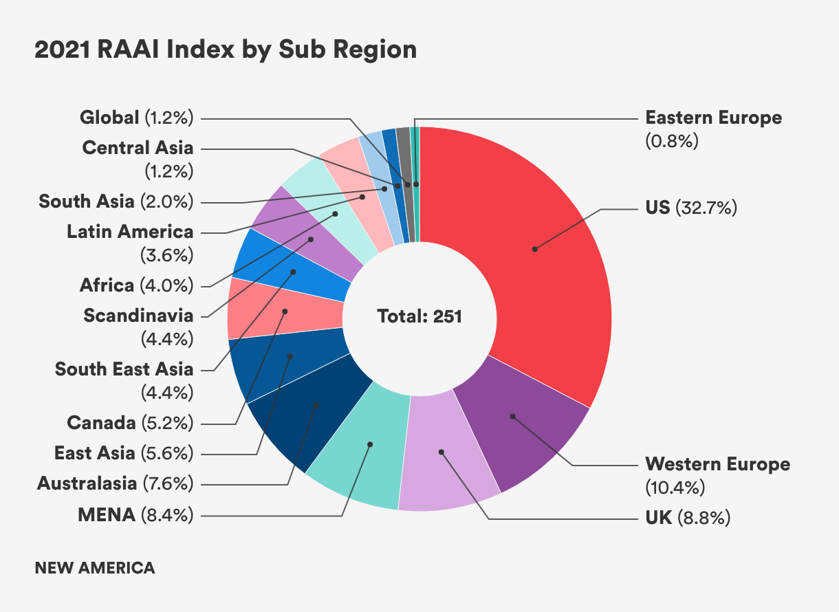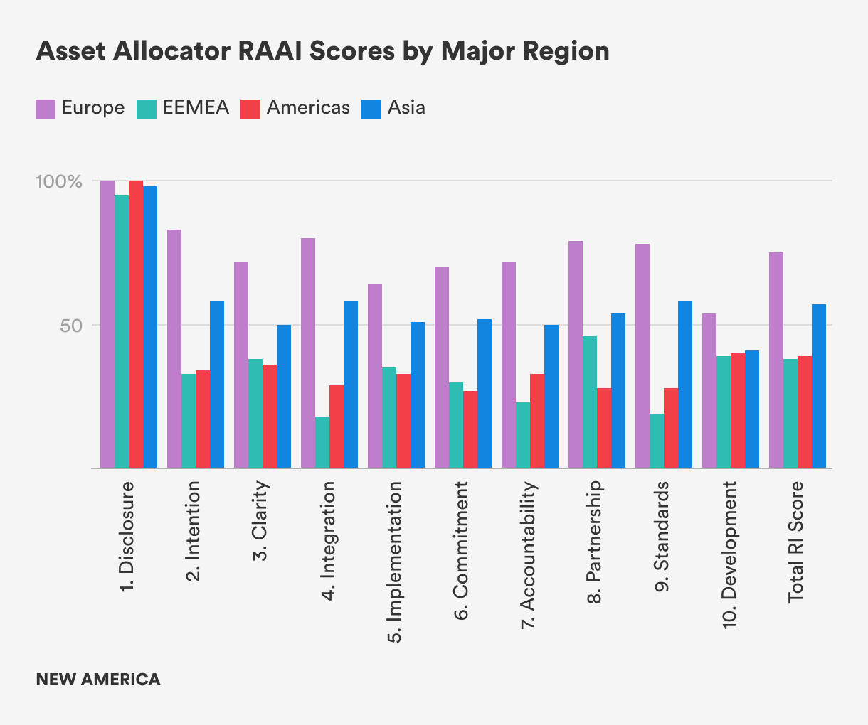 Since the RAAI launched in 2016, global asset owners have been upping their game on ESG, with the average global RAAI score rising steadily to 52 percent in 2021 up from 48 percent in 2019 and 44 percent in 2017. At the same time, the absolute level of the world average RAAI score remains low, indicating that the majority of asset owners around the world have scope for improvement. In 2021, we’re seeing that Europe, Denmark, the U.K., and the Netherlands are at the forefront of RI implementation and innovation while the United States continues to lag behind. Overall, RI is advancing across the globe, but from a low base; there remains a large divide between the top quintile performers and the rest of the world.