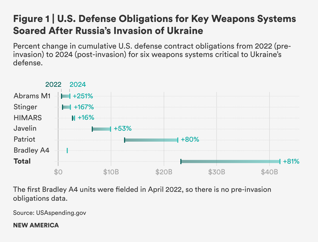 As NATO enters its most consequential phase since the Cold War, the weapons shipped to Ukraine are doing more than reshaping the battlefield. They are reordering the industrial base of the West, breathing life into places globalization forgot. The scale of this revival is striking, fueled by almost two decades’ worth of military spending compressed into three years. Since Russia’s full-scale invasion of Ukraine in 2022, the United States has obligated more than $18.7 billion for the production of six key weapons systems—HIMARS, Patriots, Stingers, Javelins, Abrams tanks, and Bradley fighting vehicles—all critical to Ukraine’s battlefield resilience. That figure represents more than 80 percent of the sum awarded for those same systems over the previous two decades, creating a wartime industrial surge that is reviving factories and supply chains across the country.