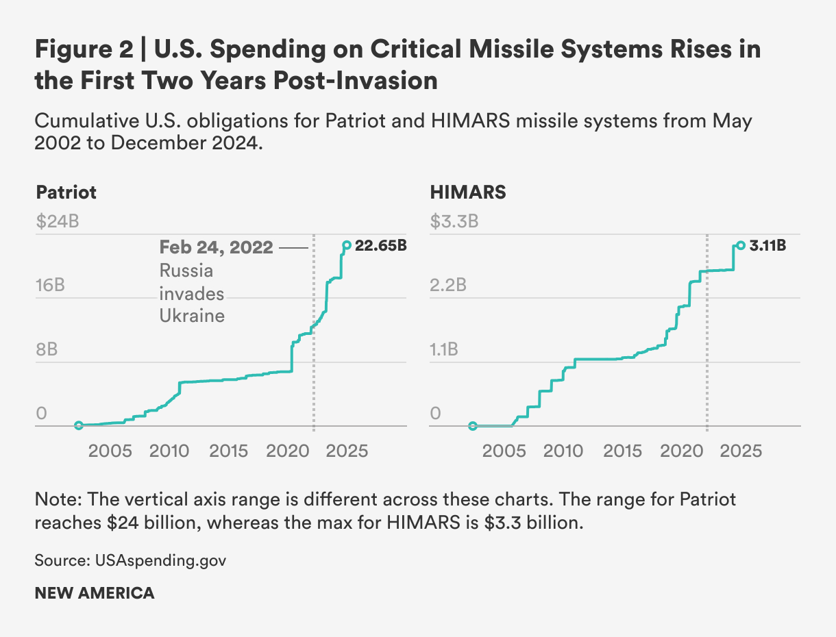 Figure 1 below illustrates the cumulative dollar value obligated by the U.S. Department of Defense for six key weapons systems supplied to Ukraine: HIMARS, Patriot systems, Javelins, Stingers, Abrams tanks, and Bradley fighting vehicles. The data shows a sharp surge in commitments between 2022 and 2024, compressing nearly two decades’ worth of spending into just three years. The steep rise reflects an unplanned industrial scale-up that is reviving U.S. defense manufacturing towns. While the largest obligations went to Patriot systems and Abrams tanks, the smallest increase—HIMARS—arguably had the most pronounced local impact, revitalizing Camden, Arkansas, where the system is produced.