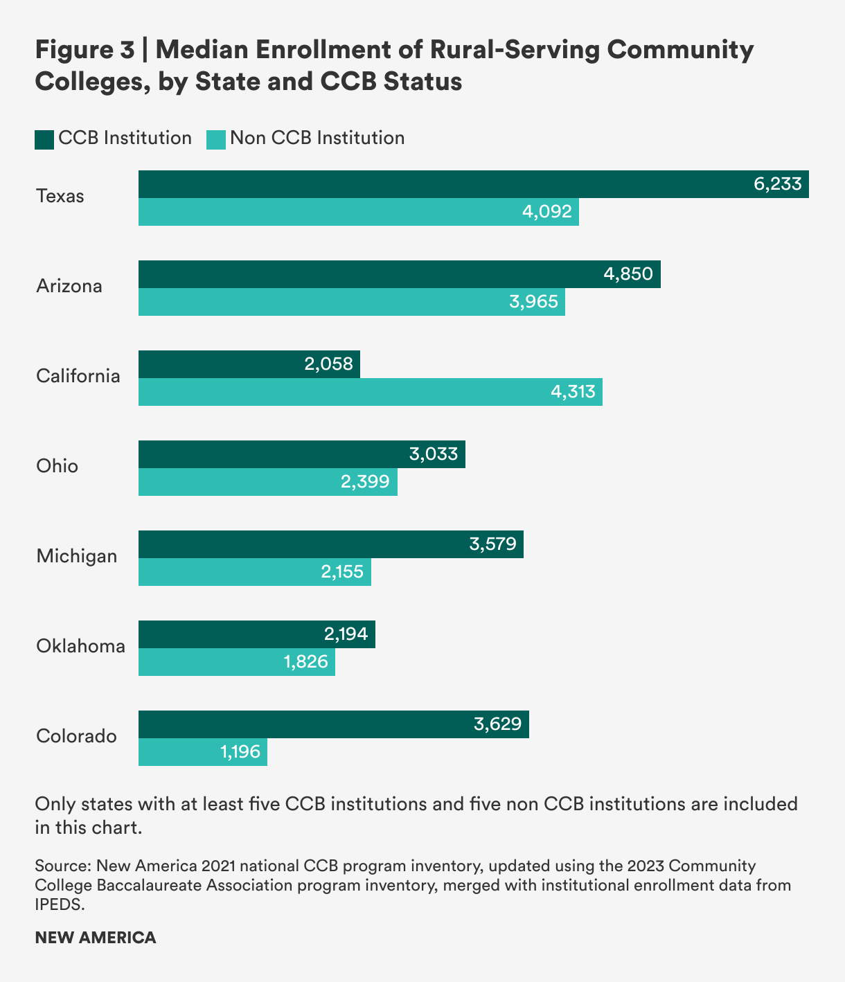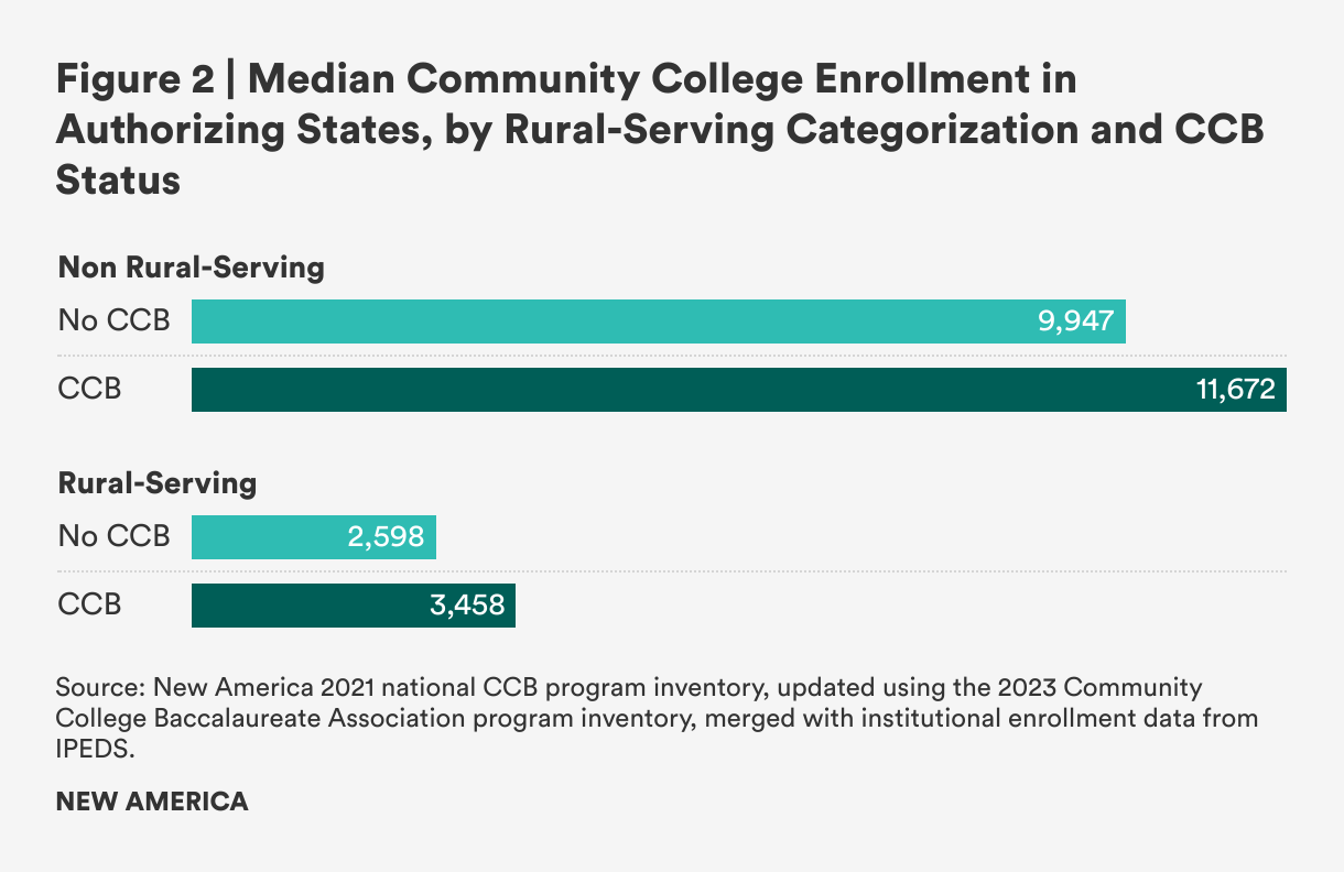 Looking only at rural-serving institutions, this pattern of higher enrollment at CCB institutions than non-CCB institutions varied in magnitude but held true across all states in our analysis except one: California. In the Golden State, community colleges interested in launching bachelor’s programs have faced significant pushback from peers within the California State University system because of concerns about program duplication. It could be, then, that the most remote rural-serving institutions in California in the most sparsely populated areas may have been most successful thus far in demonstrating unfilled need than rural-serving institutions closer to suburban and urban areas.