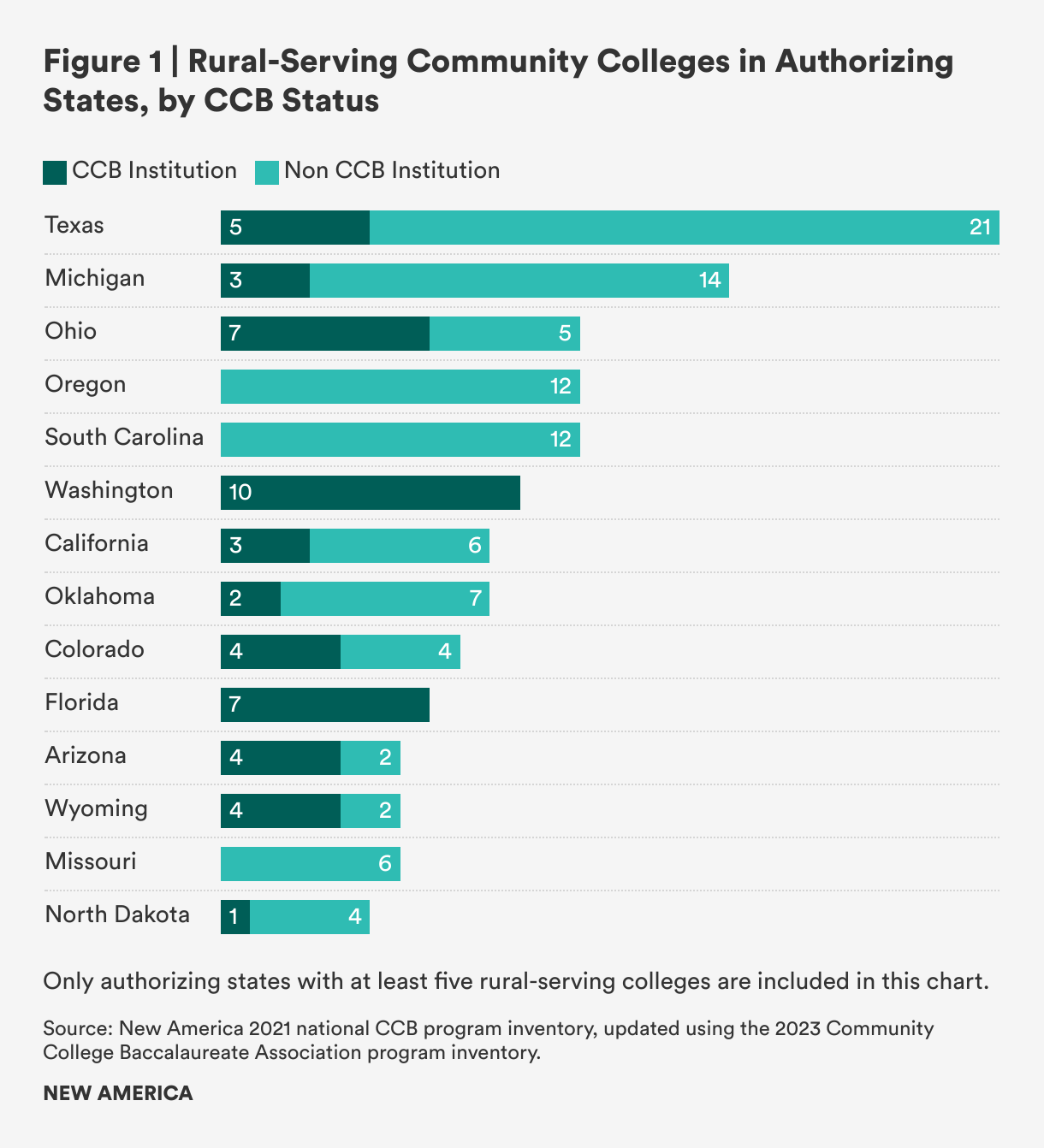 In contrast, no rural-serving community colleges in Missouri, South Carolina, or Oregon offer bachelor’s degrees. These states authorized CCB programs in 2017, 2018, and 2019, respectively, placing them among the newer states allowing bachelor’s degrees at community colleges. Some elements of state CCB legislation may help explain the dearth of rural-serving CCB institutions in these states, in addition to the fact that their CCB authorization is more recent. South Carolina only allows bachelor’s degrees at community colleges in advanced manufacturing, and Oregon excludes students in upper-division classes—i.e., those in bachelor’s degree programs—from counting in state formula funding. Missouri’s state law regarding CCBs limits these to areas of study where professional requirements or employer expectations have risen to the bachelor’s level and limits CCB authorization to instances where partnership with a university was not a viable way to expand bachelor’s opportunities to local students. Still other states, like California, Texas, and Ohio, have a mix of rural-serving community colleges with and without bachelor’s degrees.