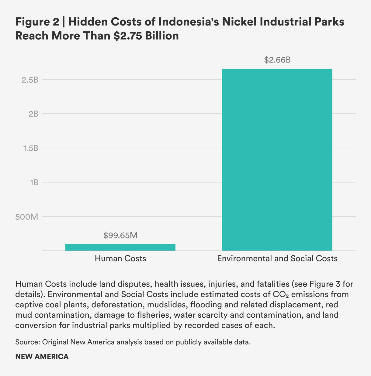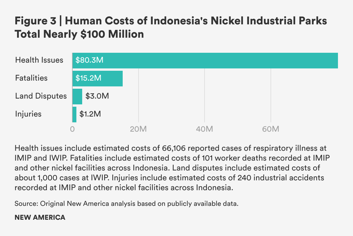 • A New America analysis finds that the hidden human and environmental costs of Indonesia’s industrial expansion total more than $2.75 billion, enough to substantially offset revenue gains from the country’s nickel exports.