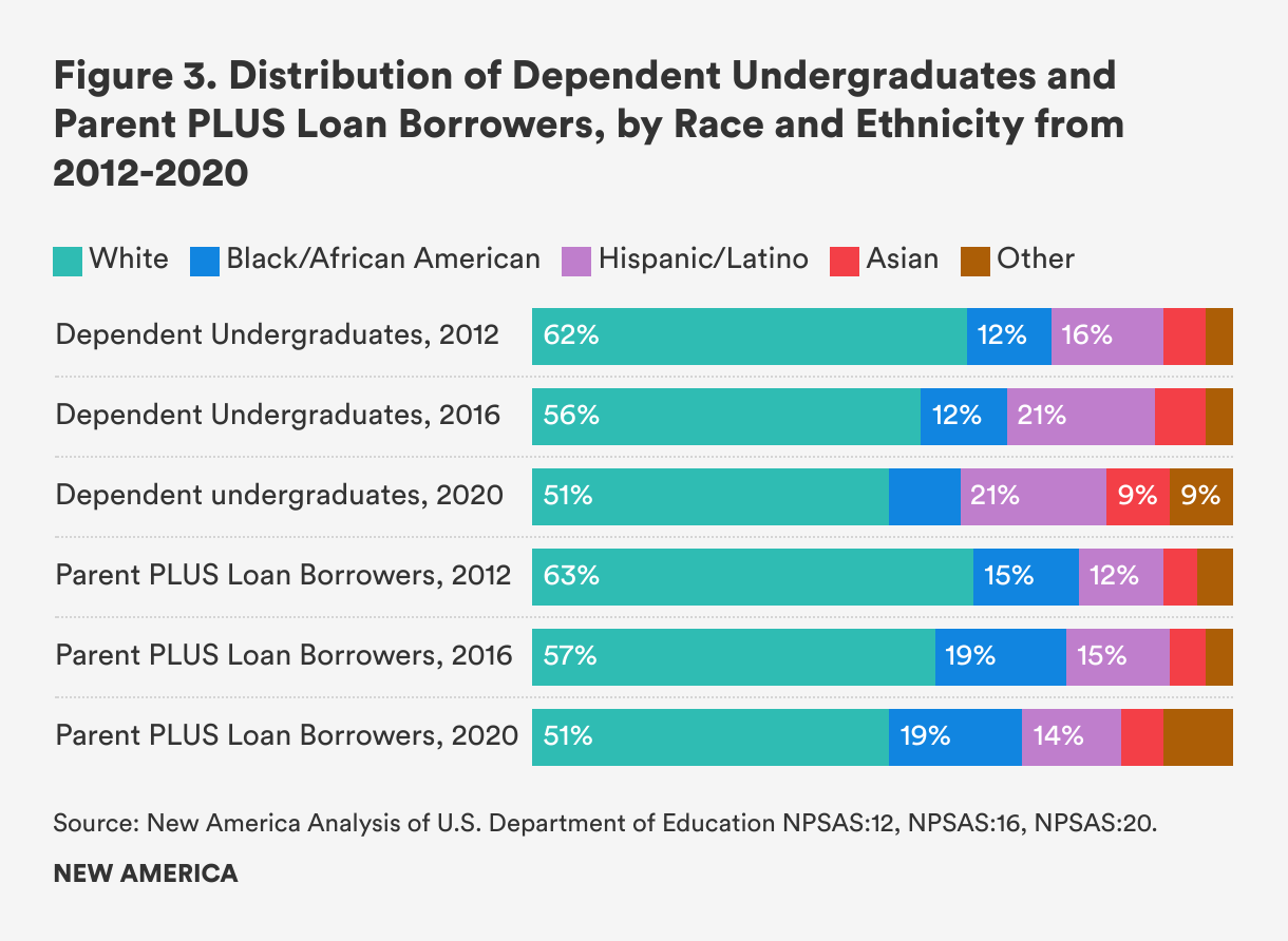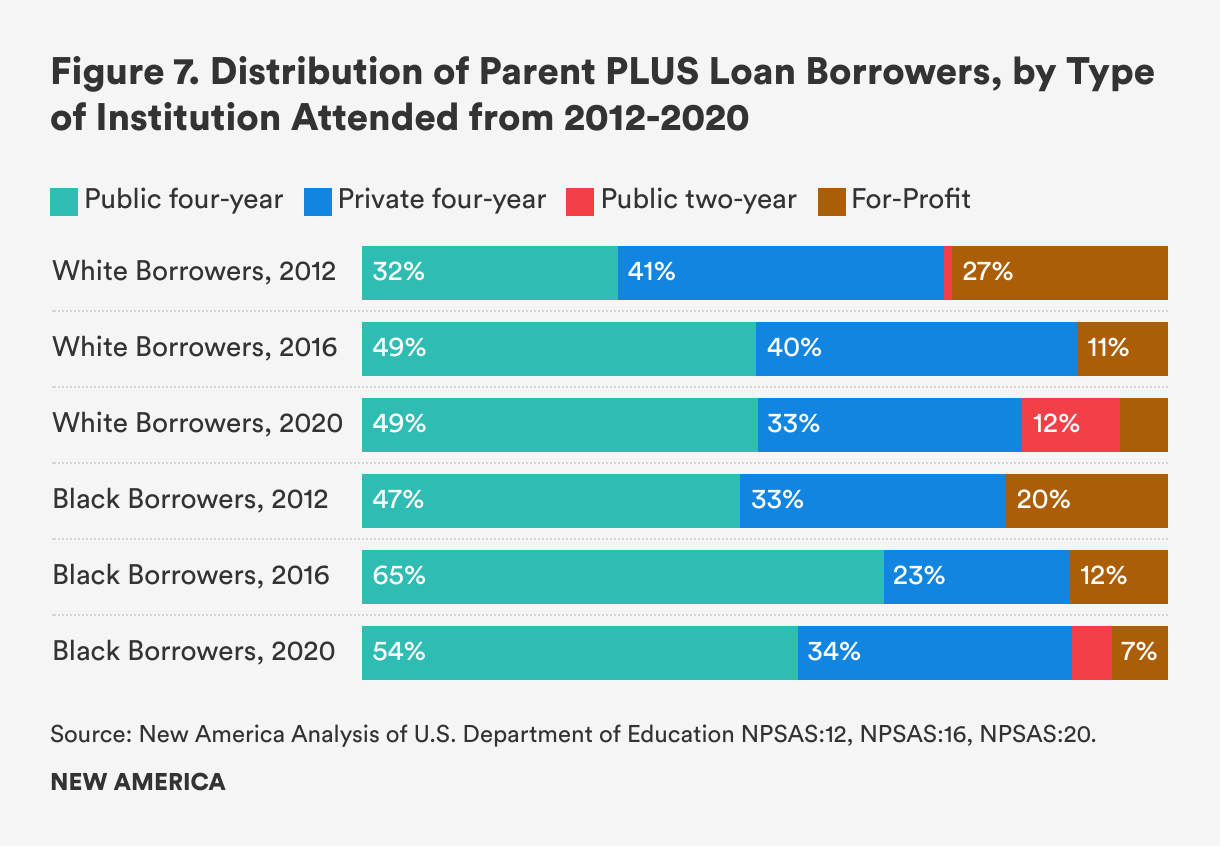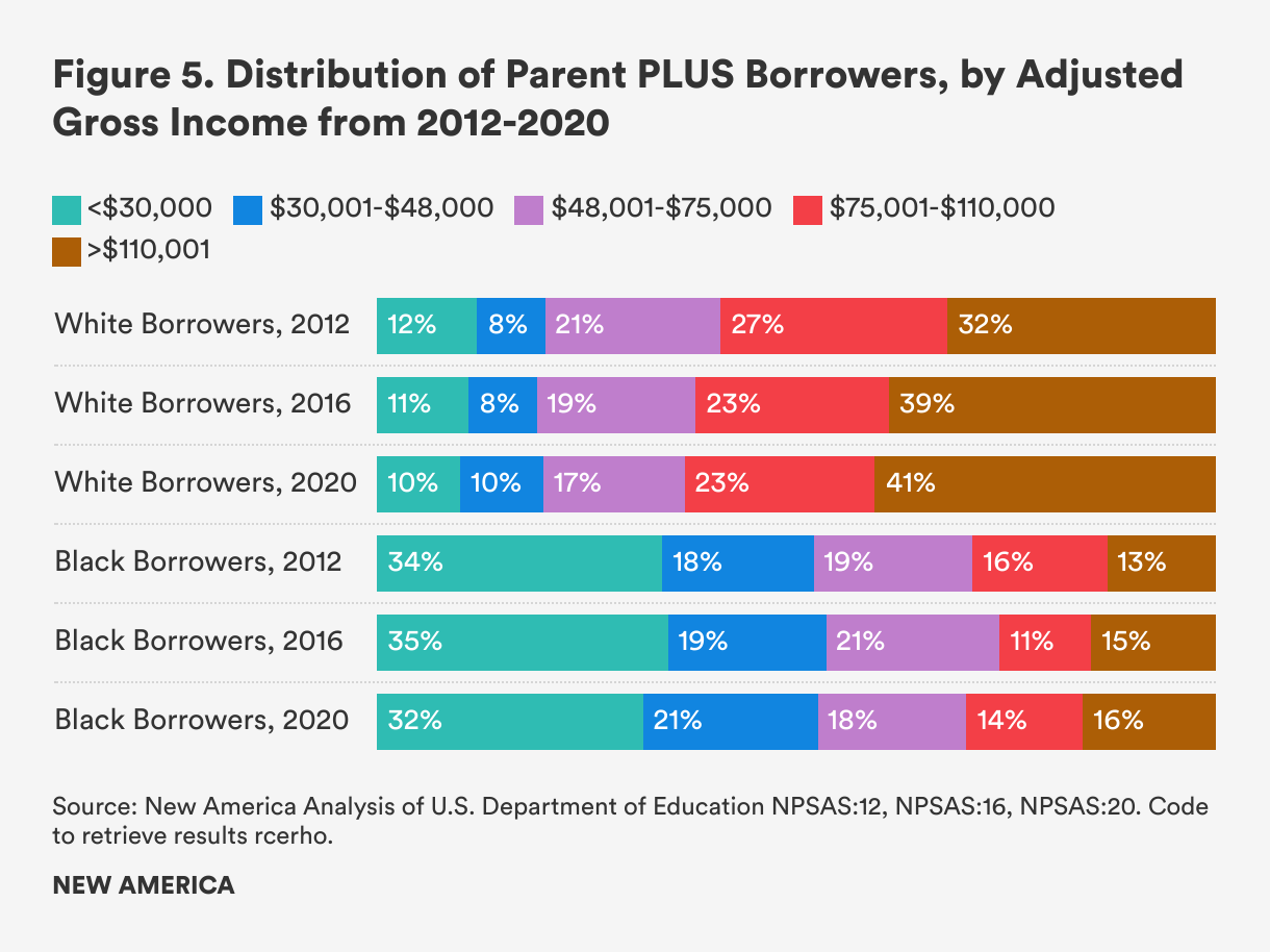 Unfortunately, the landscape of Parent PLUS loans remains largely the same as it did in 2018. I wrote then, “The federal government provides ‘access’ to higher education, via PLUS loans, to any college or university as long as a parent is approved. But if the parent is low-wealth, then a PLUS loan does not provide true access because it will ultimately result in harm and erasure of wealth when the bill is due. The switch to intergenerational debt-financing for higher education has worsened the racial wealth divide.” No policy has been put in place—or has been legitimately considered in any Congress since—that truly gets at what needs to change to ensure families aren’t actively harmed in pursuit of a higher education.