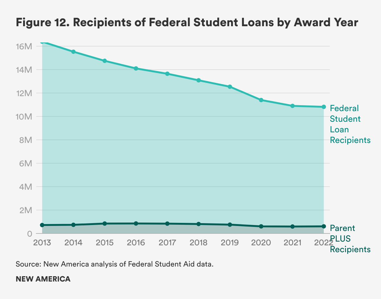 Over the years, as the economy has recovered from the Great Recession and entered a pandemic recession and recovery, enrollments in higher education have declined. With that decline has come a decline in federal student loans overall. We would have this expectation—the less students who enroll in higher education, the greater the decline in those borrowing loans. Federal student loan recipients have declined overall by nearly 6 million borrowers between 2013 and 2022. PLUS loan borrowers have also decreased over that same time frame, but not as precipitously (see Figure 12). Importantly, the decline in recipients and the increase of dollars disbursed means that parents are likely taking out larger amounts of loans.