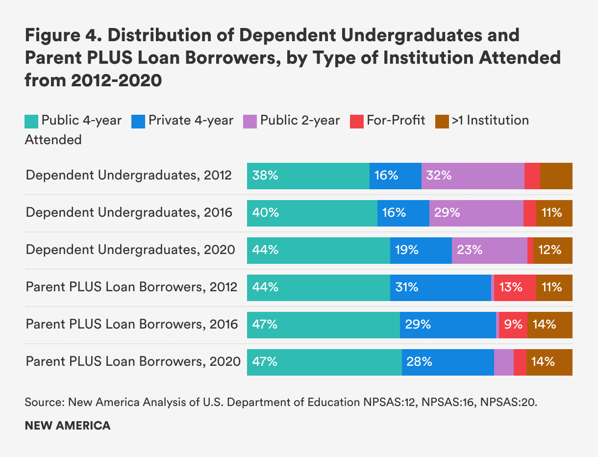 Most students whose parents borrowed PLUS continue to be enrolled in the public 4-year sector—only slightly overrepresented compared to the overall undergraduate population (See Figure 4). Private, four-year institutions and for-profit institutions both continue to be overrepresented in the proportion of families who borrow parent PLUS—although both have seen declines in the percentage of parents borrowing PLUS since 2012. Interestingly, while public 2-year colleges are underrepresented in their PLUS loan borrowing, there was a stark increase in the percentage of students who had parents borrow in 2019-20. This may be due to the pandemic and the particular hardships community college students and their families suddenly faced. This should be a trend researchers keep an eye on to determine whether the community college borrowing was indeed a pandemic blip.