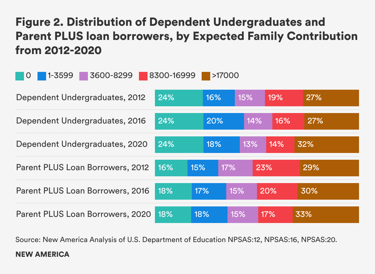 In Figure 1, I compare the distribution of dependent undergraduates to that of students whose parents borrowed PLUS by AGI. Parent PLUS borrowers tend to come from higher income families compared to the general population of dependent undergraduates overall. A majority of parent PLUS borrowers from 2012 to 2020 come from families with AGIs over $75,000. Looking at Expected Family Contribution (EFC), a measure established in law that tries to determine a family’s ability to pay for college and takes into account a variety of factors including number of children in college, the story is similar. (See Figure 2.)