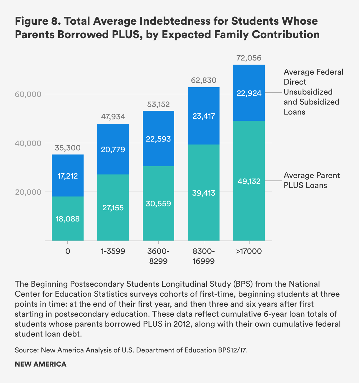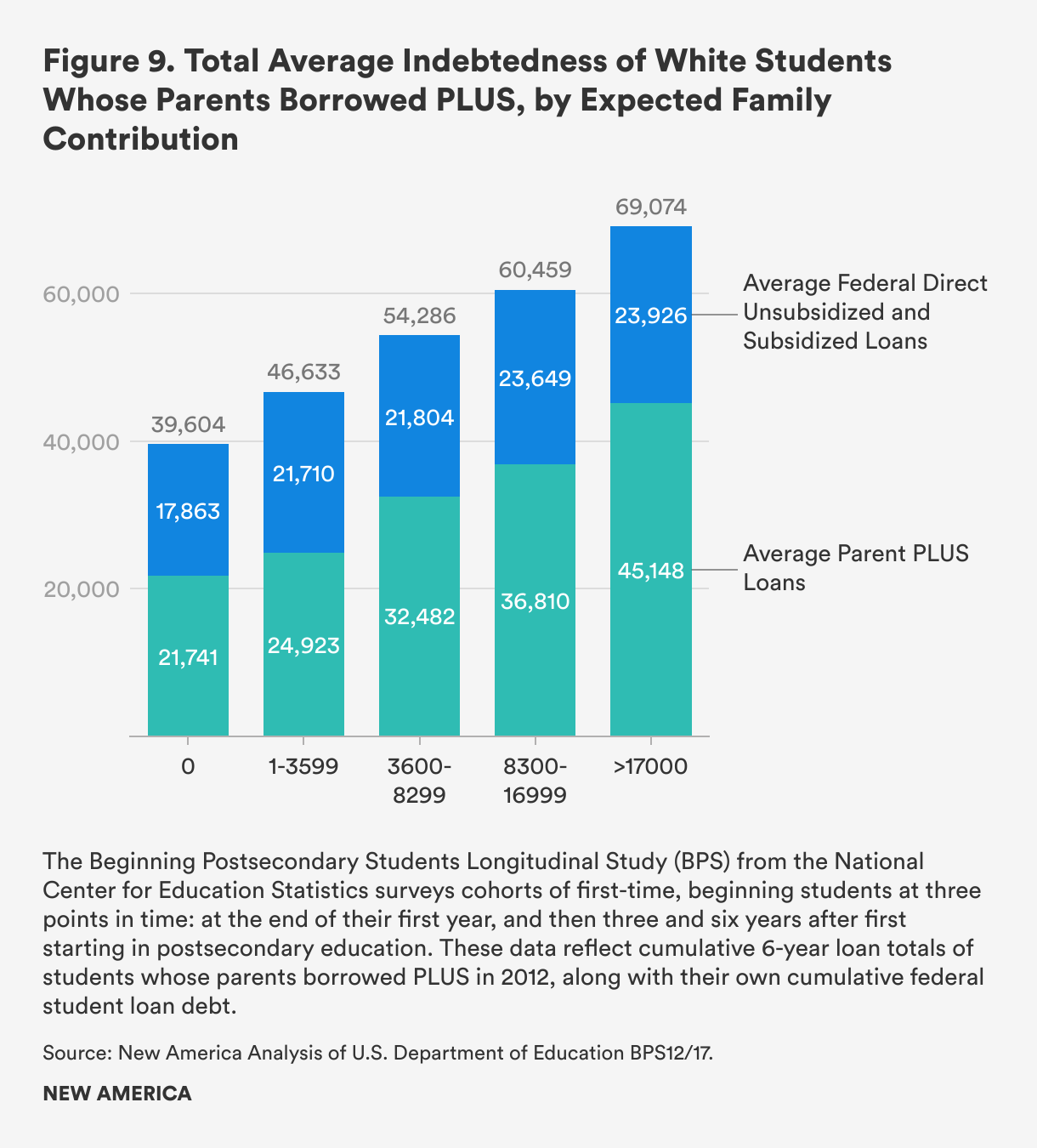 Using a different data set, the Beginning Postsecondary Students Longitudinal Study (BPS), I am able to gauge total average indebtedness for students whose parent borrowed a PLUS loan and their own average federal student loan debt. BPS surveys cohorts of first-time, beginning students at three points in time: at the end of their first year, and then three and six years after. This helps give a picture of how much intergenerational debt families are on the hook to repay for a child’s higher education. As seen in figure 8, for students who entered higher education in 2011-12 and had parents who borrowed PLUS, significant levels of debt were accumulated by both students and parents over six years. For 0 EFC families, the average family accumulated approximately $35,000 of intergenerational debt. For families with EFCs greater than 17000, the average intergenerational debt load was about $72,000.