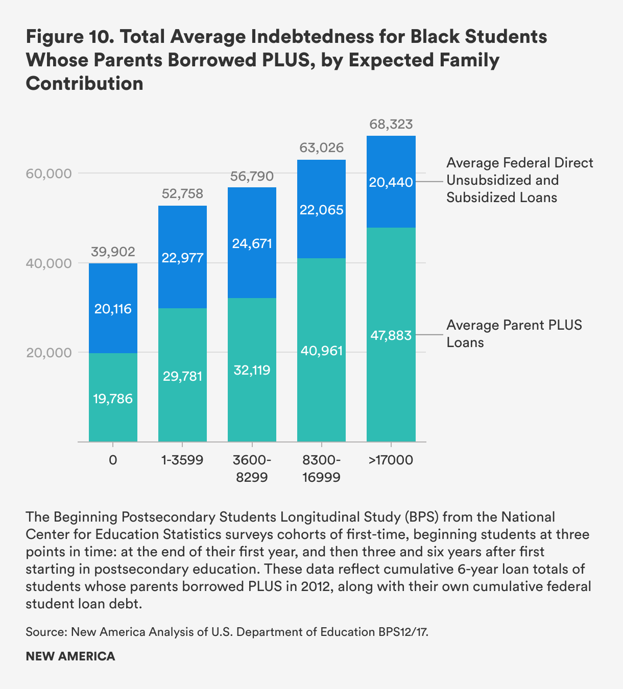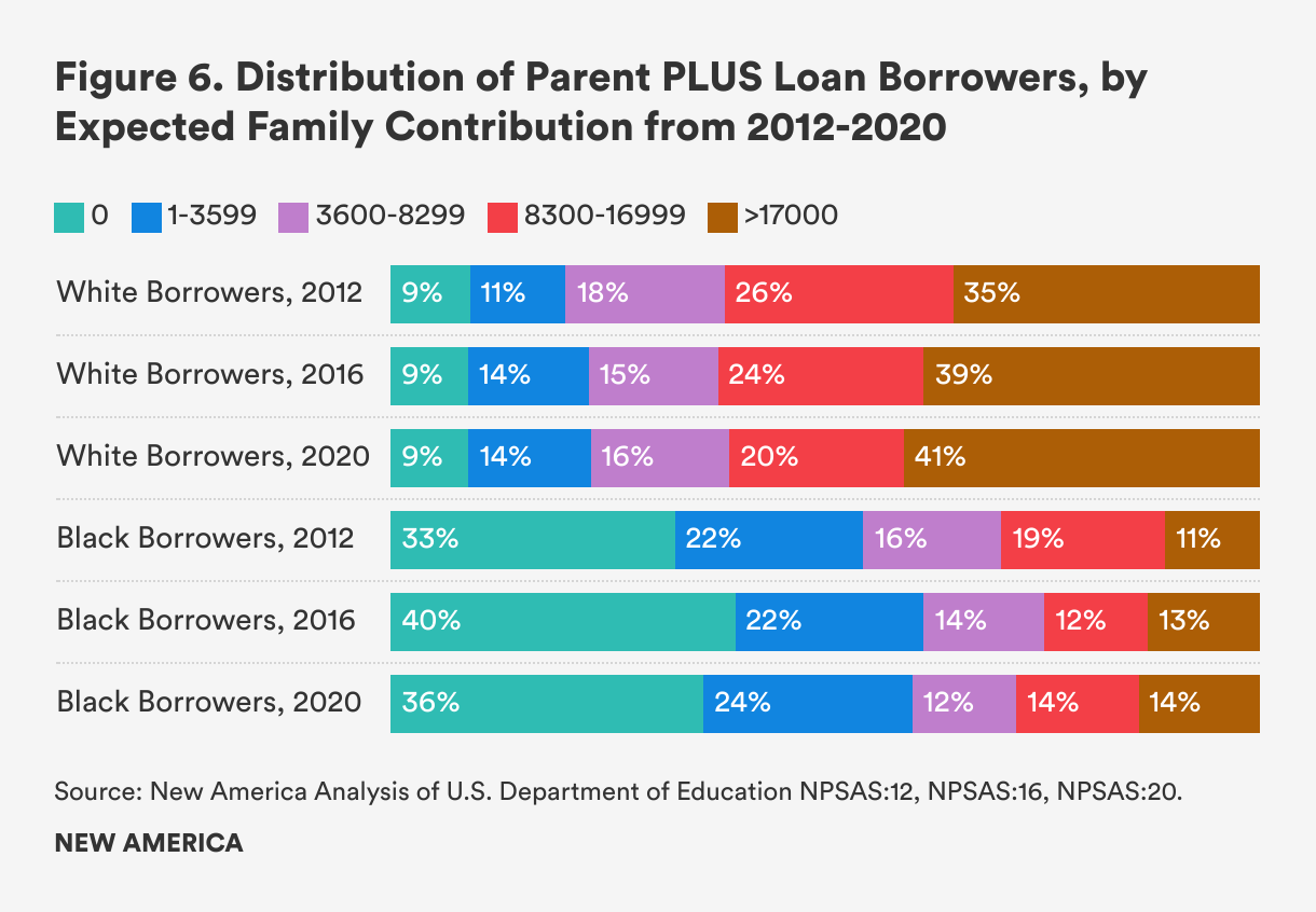 For white families, the PLUS loan works exactly as designed—middle- and higher-income families use it for liquidity, and likely given their higher incomes and EFCs, they’ll be able to afford repayment. Meanwhile a significant proportion of Black families who the government has determined cannot afford to contribute any money towards their higher education (0 EFC families) are relying on the program to fund their child’s education. This is after the student has likely exhausted Pell Grants and their own student loans.