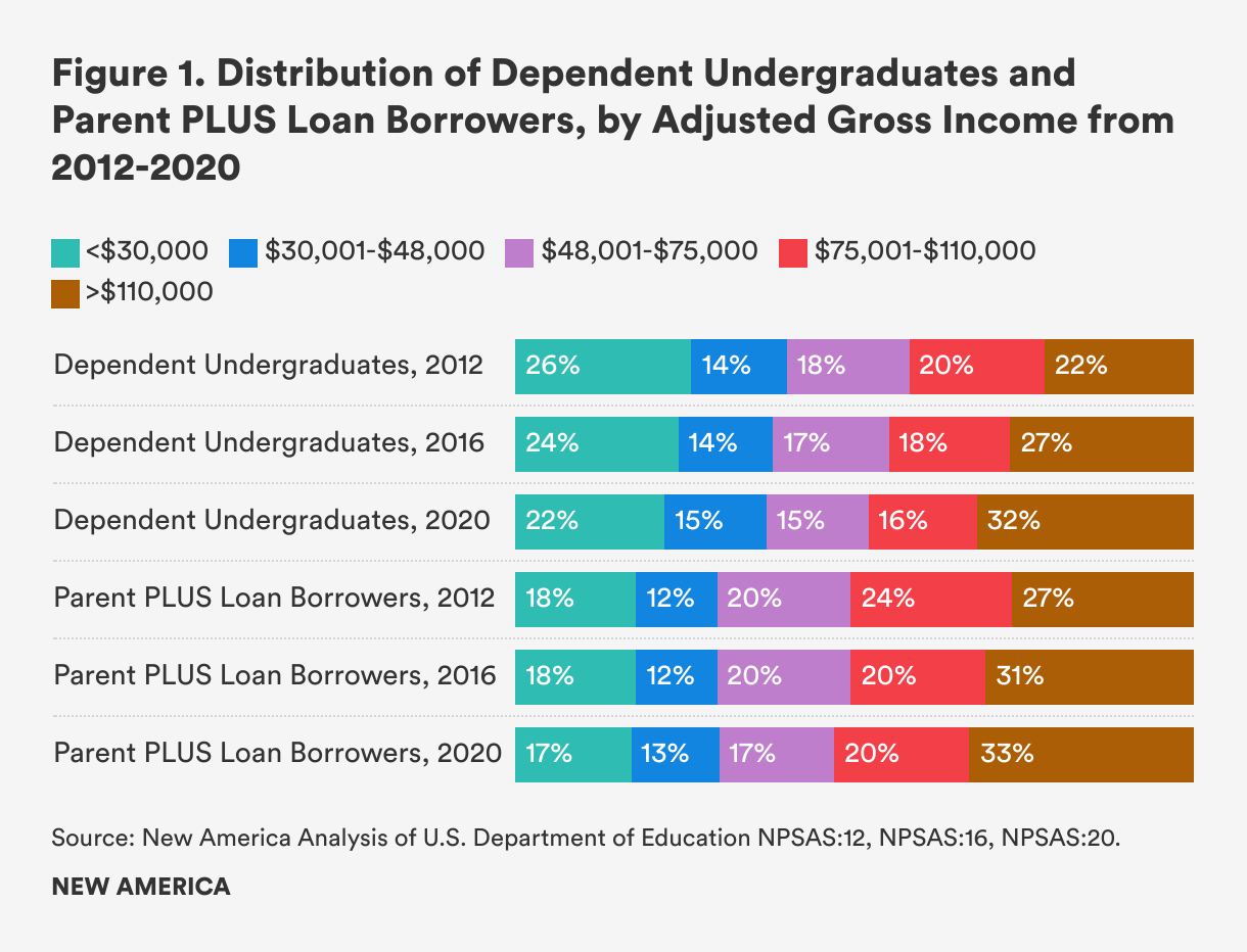 While giving more loans to low-income dependent students is not the ideal situation, given our current reliance on debt-financing for many students and families, it’s important that the loans that are taken on come with more protections than Parent PLUS loans, like access to income-driven repayment plans and lower interest rates. This also ensures the neediest of parents do not end up with non-dischargeable debt they cannot afford as they close in on retirement. Students should also be required to exhaust their own loan eligibility before their parents turn to PLUS, since federal student loans have much more flexible repayment options.