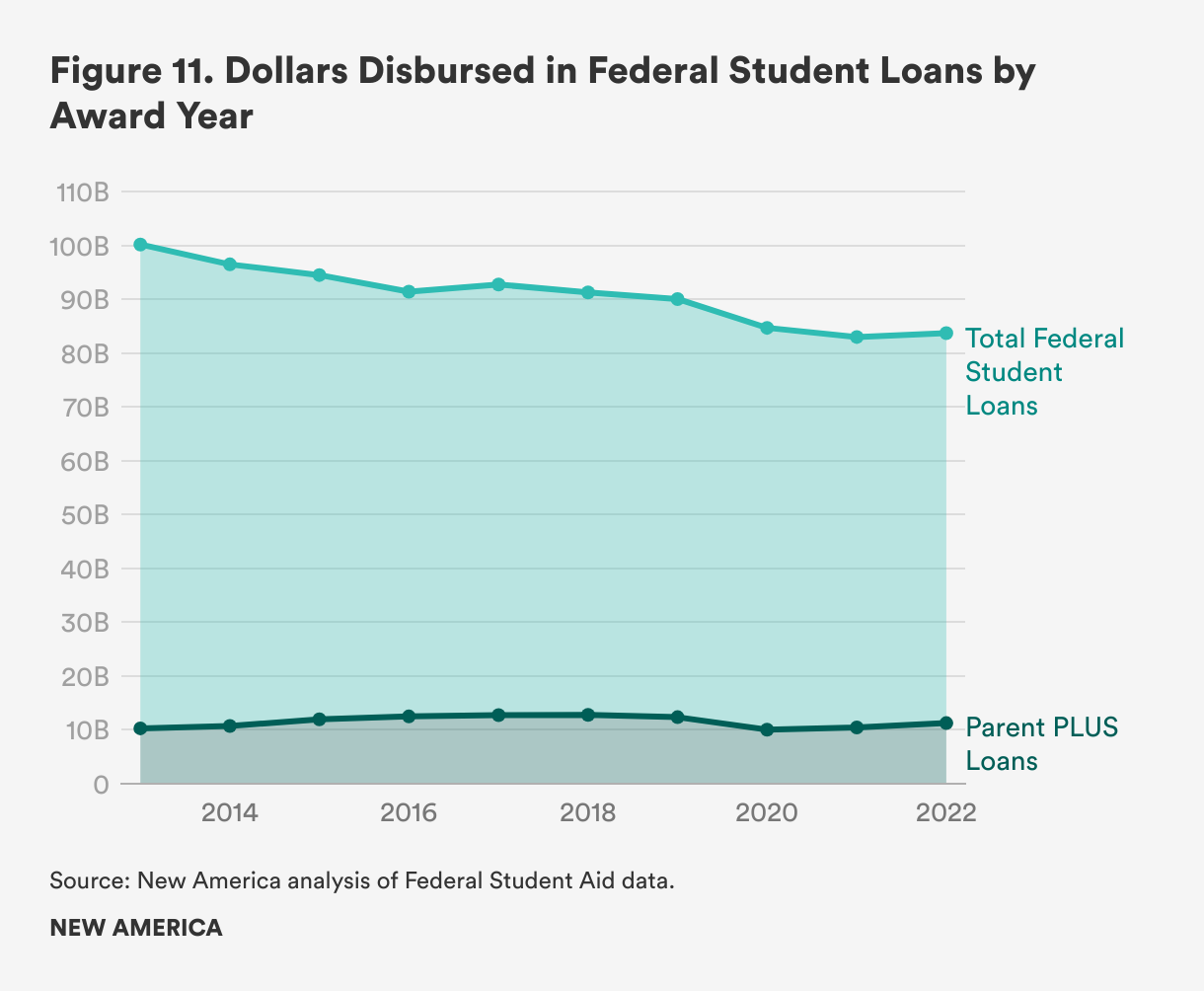 The data show concerning racial differences of who borrows PLUS loans and who can afford to pay them back, and just how much intergenerational debt families take on for higher education. Another trend to watch is that according to Federal Student Aid disbursement data, while federal student lending has decreased overall, Parent PLUS lending has remained fairly steady. This indicates reliance on this loan continues to be strong despite declining enrollments. The yearly disbursements of the federal student loans have declined by almost $10 billion from 2013 to 2022. Meanwhile Parent PLUS loan disbursements have remained fairly steady by comparison, which has resulted in a $1 billion dollar increase in 2022 compared to 2013 (see Figure 11).